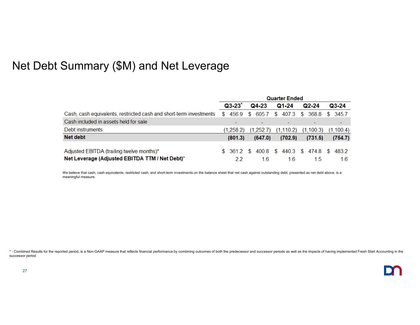 27 Net Debt Summary ($M) and Net Leverage We believe that cash, cash equivalents, restricted cash, and short-term investments on the balance sheet that net cash against outstanding debt, presented as net debt above, is a meaningful measure. * - Combined Results for the reported period, is a Non-GAAP measure that reflects financial performance by combining outcomes of both the predecessor and successor periods as well as the impacts of having implemented Fresh Start Accounting in the successor period * * *