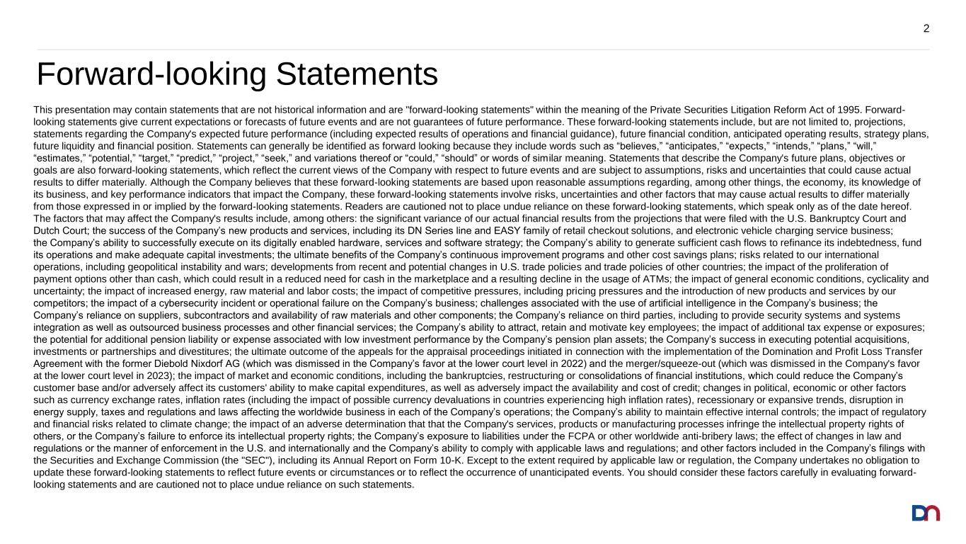 Forward-looking Statements 2 This presentation may contain statements that are not historical information and are "forward-looking statements" within the meaning of the Private Securities Litigation Reform Act of 1995. Forward- looking statements give current expectations or forecasts of future events and are not guarantees of future performance. These forward-looking statements include, but are not limited to, projections, statements regarding the Company's expected future performance (including expected results of operations and financial guidance), future financial condition, anticipated operating results, strategy plans, future liquidity and financial position. Statements can generally be identified as forward looking because they include words such as “believes,” “anticipates,” “expects,” “intends,” “plans,” “will,” “estimates,” “potential,” “target,” “predict,” “project,” “seek,” and variations thereof or “could,” “should” or words of sim ilar meaning. Statements that describe the Company's future plans, objectives or goals are also forward-looking statements, which reflect the current views of the Company with respect to future events and are subject to assumptions, risks and uncertainties that could cause actual results to differ materially. Although the Company believes that these forward-looking statements are based upon reasonable assumptions regarding, among other things, the economy, its knowledge of its business, and key performance indicators that impact the Company, these forward-looking statements involve risks, uncertainties and other factors that may cause actual results to differ materially from those expressed in or implied by the forward-looking statements. Readers are cautioned not to place undue reliance on these forward-looking statements, which speak only as of the date hereof. The factors that may affect the Company's results include, among others: the significant variance of our actual financial results from the projections that were filed with the U.S. Bankruptcy Court and Dutch Court; the success of the Company’s new products and services, including its DN Series line and EASY family of retail checkout solutions, and electronic vehicle charging service business; the Company’s ability to successfully execute on its digitally enabled hardware, services and software strategy; the Company’s ability to generate sufficient cash flows to refinance its indebtedness, fund its operations and make adequate capital investments; the ultimate benefits of the Company’s continuous improvement programs and other cost savings plans; risks related to our international operations, including geopolitical instability and wars; developments from recent and potential changes in U.S. trade policies and trade policies of other countries; the impact of the proliferation of payment options other than cash, which could result in a reduced need for cash in the marketplace and a resulting decline in the usage of ATMs; the impact of general economic conditions, cyclicality and uncertainty; the impact of increased energy, raw material and labor costs; the impact of competitive pressures, including pricing pressures and the introduction of new products and services by our competitors; the impact of a cybersecurity incident or operational failure on the Company’s business; challenges associated with the use of artificial intelligence in the Company’s business; the Company’s reliance on suppliers, subcontractors and availability of raw materials and other components; the Company’s reliance on third parties, including to provide security systems and systems integration as well as outsourced business processes and other financial services; the Company’s ability to attract, retain and motivate key employees; the impact of additional tax expense or exposures; the potential for additional pension liability or expense associated with low investment performance by the Company’s pension plan assets; the Company’s success in executing potential acquisitions, investments or partnerships and divestitures; the ultimate outcome of the appeals for the appraisal proceedings initiated in connection with the implementation of the Domination and Profit Loss Transfer Agreement with the former Diebold Nixdorf AG (which was dismissed in the Company’s favor at the lower court level in 2022) and the merger/squeeze-out (which was dismissed in the Company's favor at the lower court level in 2023); the impact of market and economic conditions, including the bankruptcies, restructuring or consolidations of financial institutions, which could reduce the Company’s customer base and/or adversely affect its customers' ability to make capital expenditures, as well as adversely impact the availability and cost of credit; changes in political, economic or other factors such as currency exchange rates, inflation rates (including the impact of possible currency devaluations in countries experiencing high inflation rates), recessionary or expansive trends, disruption in energy supply, taxes and regulations and laws affecting the worldwide business in each of the Company’s operations; the Company’s ability to maintain effective internal controls; the impact of regulatory and financial risks related to climate change; the impact of an adverse determination that that the Company's services, products or manufacturing processes infringe the intellectual property rights of others, or the Company’s failure to enforce its intellectual property rights; the Company’s exposure to liabilities under the FCPA or other worldwide anti-bribery laws; the effect of changes in law and regulations or the manner of enforcement in the U.S. and internationally and the Company’s ability to comply with applicable laws and regulations; and other factors included in the Company’s filings with the Securities and Exchange Commission (the "SEC"), including its Annual 