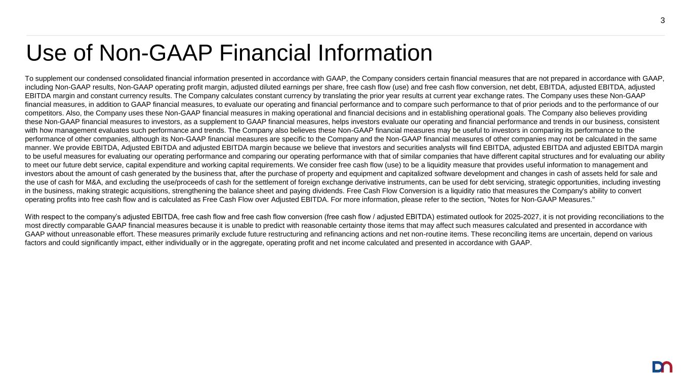 Use of Non-GAAP Financial Information 3 To supplement our condensed consolidated financial information presented in accordance with GAAP, the Company considers certain financial measures that are not prepared in accordance with GAAP, including Non-GAAP results, Non-GAAP operating profit margin, adjusted diluted earnings per share, free cash flow (use) and free cash flow conversion, net debt, EBITDA, adjusted EBITDA, adjusted EBITDA margin and constant currency results. The Company calculates constant currency by translating the prior year results at current year exchange rates. The Company uses these Non-GAAP financial measures, in addition to GAAP financial measures, to evaluate our operating and financial performance and to compare such performance to that of prior periods and to the performance of our competitors. Also, the Company uses these Non-GAAP financial measures in making operational and financial decisions and in establishing operational goals. The Company also believes providing these Non-GAAP financial measures to investors, as a supplement to GAAP financial measures, helps investors evaluate our operating and financial performance and trends in our business, consistent with how management evaluates such performance and trends. The Company also believes these Non-GAAP financial measures may be useful to investors in comparing its performance to the performance of other companies, although its Non-GAAP financial measures are specific to the Company and the Non-GAAP financial measures of other companies may not be calculated in the same manner. We provide EBITDA, Adjusted EBITDA and adjusted EBITDA margin because we believe that investors and securities analysts will find EBITDA, adjusted EBITDA and adjusted EBITDA margin to be useful measures for evaluating our operating performance and comparing our operating performance with that of similar companies that have different capital structures and for evaluating our ability to meet our future debt service, capital expenditure and working capital requirements. We consider free cash flow (use) to be a liquidity measure that provides useful information to management and investors about the amount of cash generated by the business that, after the purchase of property and equipment and capitalized software development and changes in cash of assets held for sale and the use of cash for M&A, and excluding the use/proceeds of cash for the settlement of foreign exchange derivative instruments, can be used for debt servicing, strategic opportunities, including investing in the business, making strategic acquisitions, strengthening the balance sheet and paying dividends. Free Cash Flow Conversion is a liquidity ratio that measures the Company's ability to convert operating profits into free cash flow and is calculated as Free Cash Flow over Adjusted EBITDA. For more information, please refer to the section, "Notes for Non-GAAP Measures." With respect to the company’s adjusted EBITDA, free cash flow and free cash flow conversion (free cash flow / adjusted EBITDA) estimated outlook for 2025-2027, it is not providing reconciliations to the most directly comparable GAAP financial measures because it is unable to predict with reasonable certainty those items that may affect such measures calculated and presented in accordance with GAAP without unreasonable effort. These measures primarily exclude future restructuring and refinancing actions and net non-routine items. These reconciling items are uncertain, depend on various factors and could significantly impact, either individually or in the aggregate, operating profit and net income calculated and presented in accordance with GAAP.