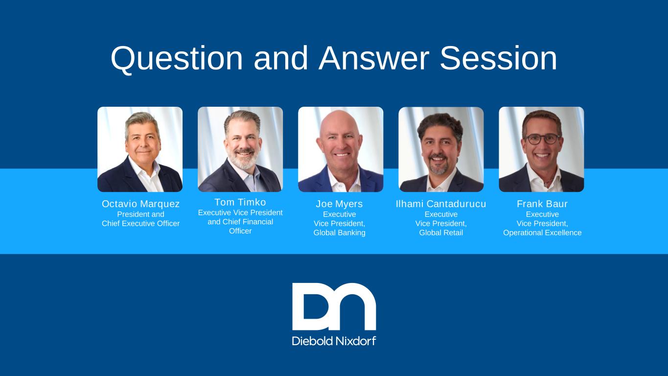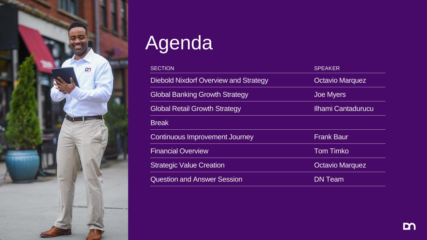 Agenda SECTION SPEAKER Diebold Nixdorf Overview and Strategy Octavio Marquez Global Banking Growth Strategy Joe Myers Global Retail Growth Strategy Ilhami Cantadurucu Break Continuous Improvement Journey Frank Baur Financial Overview Tom Timko Strategic Value Creation Octavio Marquez Question and Answer Session DN Team