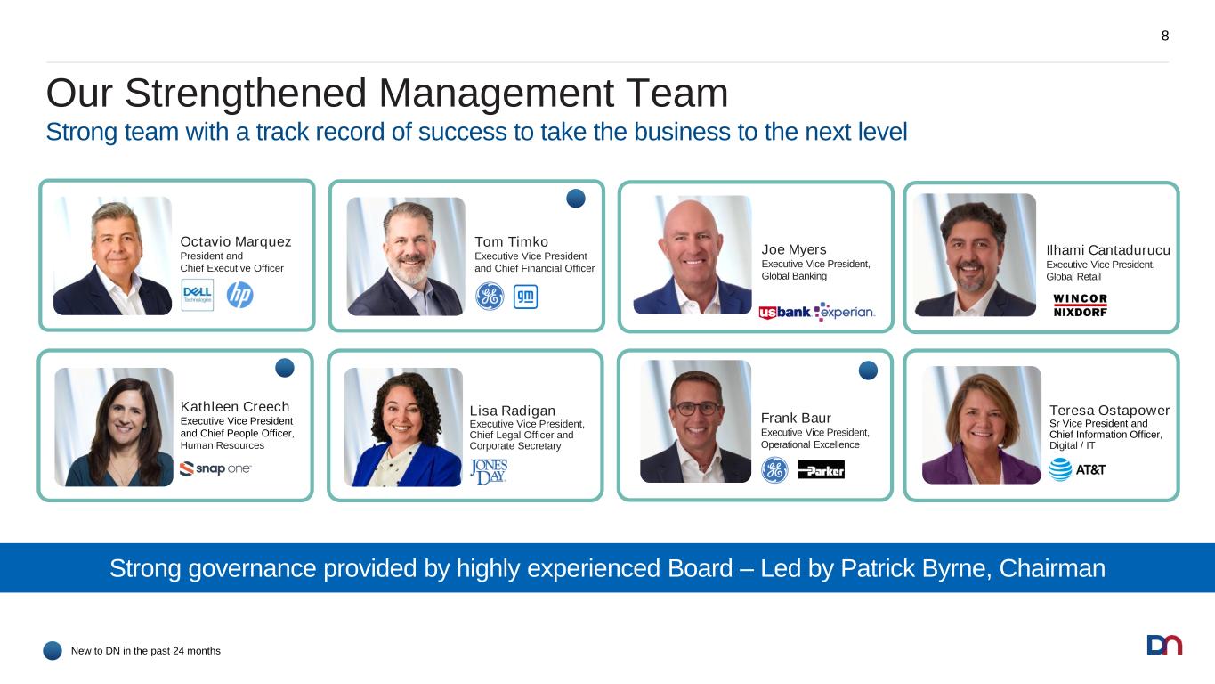 Diebold Nixdorf Investment Thesis 7 Delivering value creation across three key drivers Well positioned to capitalize on growing TAMs, AI integration trends and shifting consumer preference to self-service in Banking and Retail Capturing Secular Tailwinds We are in the initial stages of our LEAN journey driving significant profitability improvement and expanding efforts across the company Driving Growth & Profitability We plan to deliver significant and growing FCF conversion which enables further investment for growth and increased shareholder return Increasing Cash Generation Targeting annual double-digit adjusted EBITDA growth by 2027 & 60%+ FCF conversion