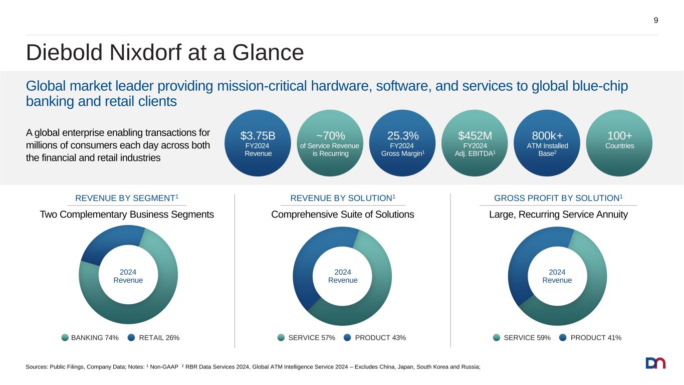 Diebold Nixdorf at a Glance 9 800k+ ATM Installed Base2 $452M FY2024 Adj. EBITDA1 25.3% FY2024 Gross Margin1 ~70% of Service Revenue is Recurring $3.75B FY2024 Revenue Global market leader providing mission-critical hardware, software, and services to global blue-chip banking and retail clients A global enterprise enabling transactions for millions of consumers each day across both the financial and retail industries 2024 Revenue RETAIL 26%BANKING 74% REVENUE BY SEGMENT1 2024 Revenue PRODUCT 43%SERVICE 57% REVENUE BY SOLUTION1 2024 Revenue GROSS PROFIT BY SOLUTION1 Sources: Public Filings, Company Data; Notes: 1 Non-GAAP 2 RBR Data Services 2024, Global ATM Intelligence Service 2024 – Excludes China, Japan, South Korea and Russia; 100+ Countries Two Complementary Business Segments Comprehensive Suite of Solutions Large, Recurring Service Annuity PRODUCT 41%SERVICE 59%