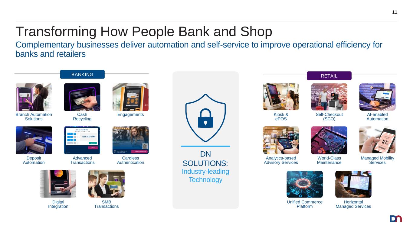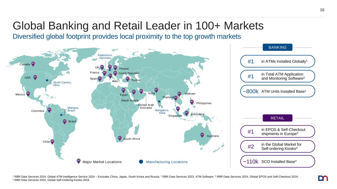 Global Banking and Retail Leader in 100+ Markets 10 RETAIL SCO Installed Base4~110k in the Global Market for Self-ordering Kiosks4#2 in EPOS & Self-Checkout shipments in Europe3#1 BANKING ATM Units Installed Base1~800k in Total ATM Application and Monitoring Software2#1 in ATMs Installed Globally1#1 BANKING 1 RBR Data Services 2024, Global ATM Intelligence Service 2024 – Excludes China, Japan, South Korea and Russia; 2 RBR Data Services 2023, ATM Software; 3 RBR Data Services 2024, Global EPOS and Self-Checkout 2024; 4 RBR Data Services 2024, Global Self-Ordering Kiosks 2024 Canada USA Mexico Colombia Brazil Chile Australia Indonesia Philippines Vietnam Thailand India Singapore United Arab Emirates Poland Czech Republic Turkey UK France Spain Italy South Africa Egypt Saudi Arabia Diversified global footprint provides local proximity to the top growth markets North Canton, Ohio Manaus, Brazil Paderborn, Germany Major Market Locations Manufacturing Locations Bengaluru, India