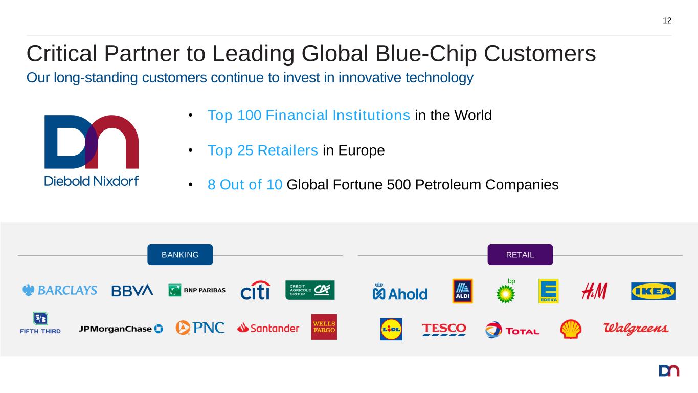 Transforming How People Bank and Shop 11 Complementary businesses deliver automation and self-service to improve operational efficiency for banks and retailers DN SOLUTIONS: Industry-leading Technology BANKING SMB Transactions Digital Integration Cardless Authentication Deposit Automation Advanced Transactions Cash Recycling EngagementsBranch Automation Solutions RETAIL Horizontal Managed Services Unified Commerce Platform World-Class Maintenance Analytics-based Advisory Services Managed Mobility Services Kiosk & ePOS Self-Checkout (SCO) AI-enabled Automation