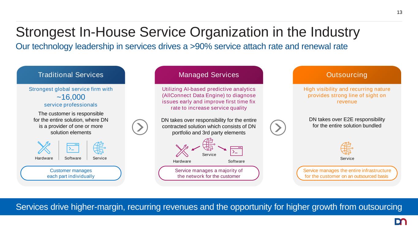 Strongest In-House Service Organization in the Industry 13 Our technology leadership in services drives a >90% service attach rate and renewal rate Service manages a majority of the network for the customer Managed Services Utilizing AI-based predictive analytics (AllConnect Data Engine) to diagnose issues early and improve first time fix rate to increase service quality DN takes over responsibility for the entire contracted solution which consists of DN portfolio and 3rd party elements Service SoftwareHardware Customer manages each part individually Traditional Services Strongest global service firm with ~16,000 service professionals The customer is responsible for the entire solution, where DN is a provider of one or more solution elements ServiceSoftwareHardware Service manages the entire infrastructure for the customer on an outsourced basis Outsourcing High visibility and recurring nature provides strong line of sight on revenue DN takes over E2E responsibility for the entire solution bundled Service Services drive higher-margin, recurring revenues and the opportunity for higher growth from outsourcing