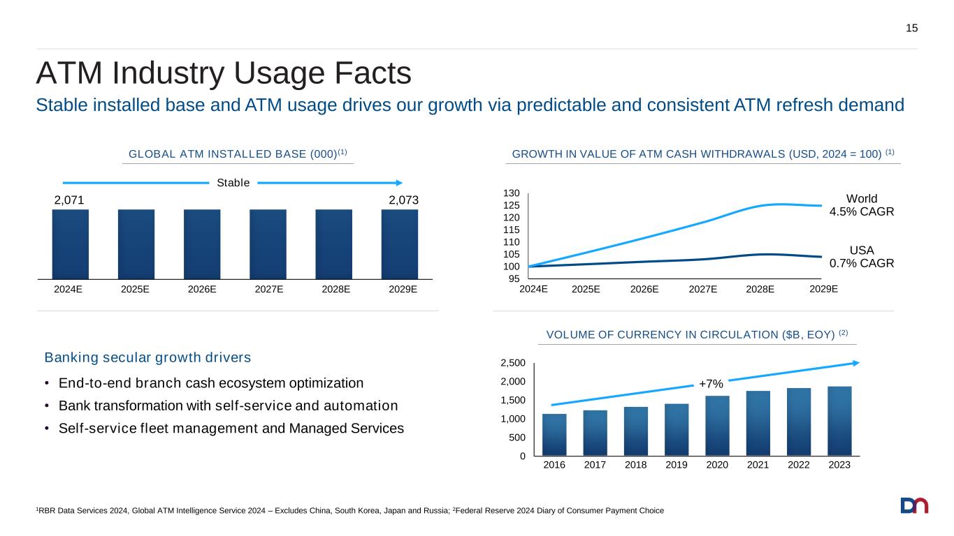 Two Large and Growing Global TAMs 14 Unlocking additional growth opportunities via Banking branch automation and Retail AI-driven checkout TAM based on available market data and internal management estimates; Banking TAM contemplates traditional ATM market + additional TAM from Branch Automation Solutions BANKING ~$20B • Low-single digit annual growth rate • Expanding DN’s addressable market via Branch Automation Solutions RETAIL ~$12B • Mid-single digit annual growth rate • Expanding DN’s addressable market via AI-driven checkout Strong service mix and attach rates support higher growth and margins in both Banking and Retail