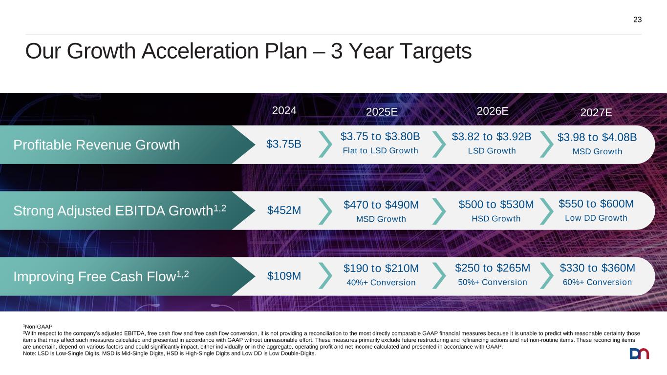 23 Our Growth Acceleration Plan – 3 Year Targets 1Non-GAAP 2With respect to the company’s adjusted EBITDA, free cash flow and free cash flow conversion, it is not providing a reconciliation to the most directly comparable GAAP financial measures because it is unable to predict with reasonable certainty those items that may affect such measures calculated and presented in accordance with GAAP without unreasonable effort. These measures primarily exclude future restructuring and refinancing actions and net non-routine items. These reconciling items are uncertain, depend on various factors and could significantly impact, either individually or in the aggregate, operating profit and net income calculated and presented in accordance with GAAP. Note: LSD is Low-Single Digits, MSD is Mid-Single Digits, HSD is High-Single Digits and Low DD is Low Double-Digits. $3.75 to $3.80B Flat to LSD Growth $3.75BProfitable Revenue Growth 2027E2025E2024 Strong Adjusted EBITDA Growth1,2 $470 to $490M MSD Growth $452M Improving Free Cash Flow1,2 $190 to $210M 40%+ Conversion $109M 2026E $3.82 to $3.92B LSD Growth $3.98 to $4.08B MSD Growth $500 to $530M HSD Growth $550 to $600M Low DD Growth $330 to $360M 60%+ Conversion $250 to $265M 50%+ Conversion