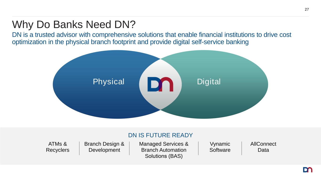 Why Do Banks Need DN? 27 DN IS FUTURE READY ATMs & Recyclers Branch Design & Development Managed Services & Branch Automation Solutions (BAS) Vynamic Software AllConnect Data DN is a trusted advisor with comprehensive solutions that enable financial institutions to drive cost optimization in the physical branch footprint and provide digital self-service banking Physical Digital