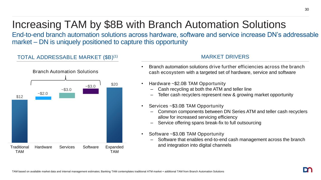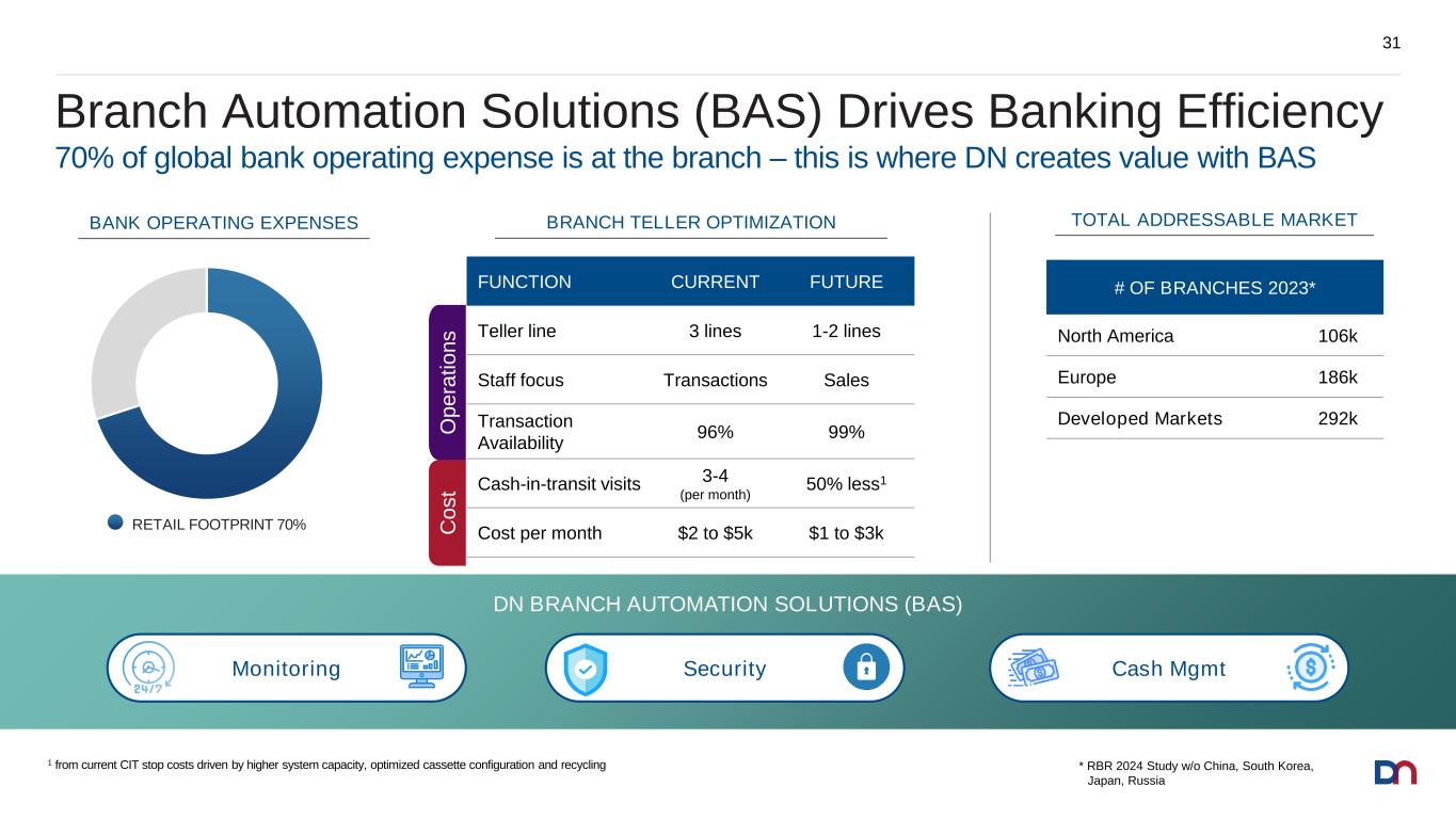 Increasing TAM by $8B with Branch Automation Solutions $12 $20 ~$2.0 ~$3.0 ~$3.0 Traditional TAM Hardware Services Software Expanded TAM TOTAL ADDRESSABLE MARKET ($B)(1) MARKET DRIVERS End-to-end branch automation solutions across hardware, software and service increase DN’s addressable market – DN is uniquely positioned to capture this opportunity • Branch automation solutions drive further efficiencies across the branch cash ecosystem with a targeted set of hardware, service and software • Hardware ~$2.0B TAM Opportunity ‒ Cash recycling at both the ATM and teller line ‒ Teller cash recyclers represent new & growing market opportunity • Services ~$3.0B TAM Opportunity ‒ Common components between DN Series ATM and teller cash recyclers allow for increased servicing efficiency ‒ Service offering spans break-fix to full outsourcing • Software ~$3.0B TAM Opportunity ‒ Software that enables end-to-end cash management across the branch and integration into digital channels 30 Branch Automation Solutions TAM based on available market data and internal management estimates; Banking TAM contemplates traditional ATM market + additional TAM from Branch Automation Solutions