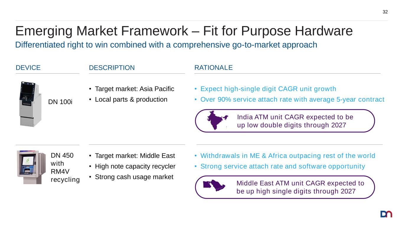 * RBR 2024 Study w/o China, South Korea, Japan, Russia Branch Automation Solutions (BAS) Drives Banking Efficiency 31 Monitoring Security Cash Mgmt DN BRANCH AUTOMATION SOLUTIONS (BAS) FUNCTION CURRENT FUTURE Teller line 3 lines 1-2 lines Staff focus Transactions Sales Transaction Availability 96% 99% Cash-in-transit visits 3-4 (per month) 50% less1 Cost per month $2 to $5k $1 to $3k BANK OPERATING EXPENSES TOTAL ADDRESSABLE MARKET RETAIL FOOTPRINT 70% 1 from current CIT stop costs driven by higher system capacity, optimized cassette configuration and recycling # OF BRANCHES 2023* North America 106k Europe 186k Developed Markets 292k BRANCH TELLER OPTIMIZATION 70% of global bank operating expense is at the branch – this is where DN creates value with BAS O p e ra ti o n s C o s t