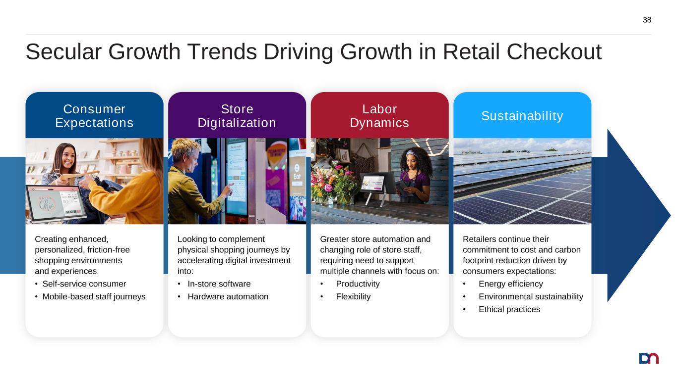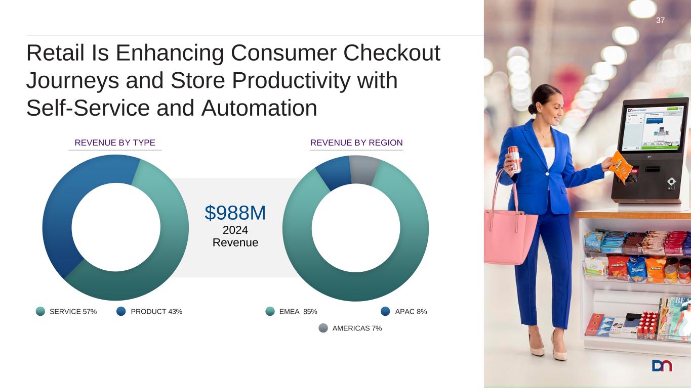 $988M 2024 Revenue Retail Is Enhancing Consumer Checkout Journeys and Store Productivity with Self-Service and Automation 37 REVENUE BY REGION PRODUCT 43%SERVICE 57% APAC 8%EMEA 85% AMERICAS 7% REVENUE BY TYPE