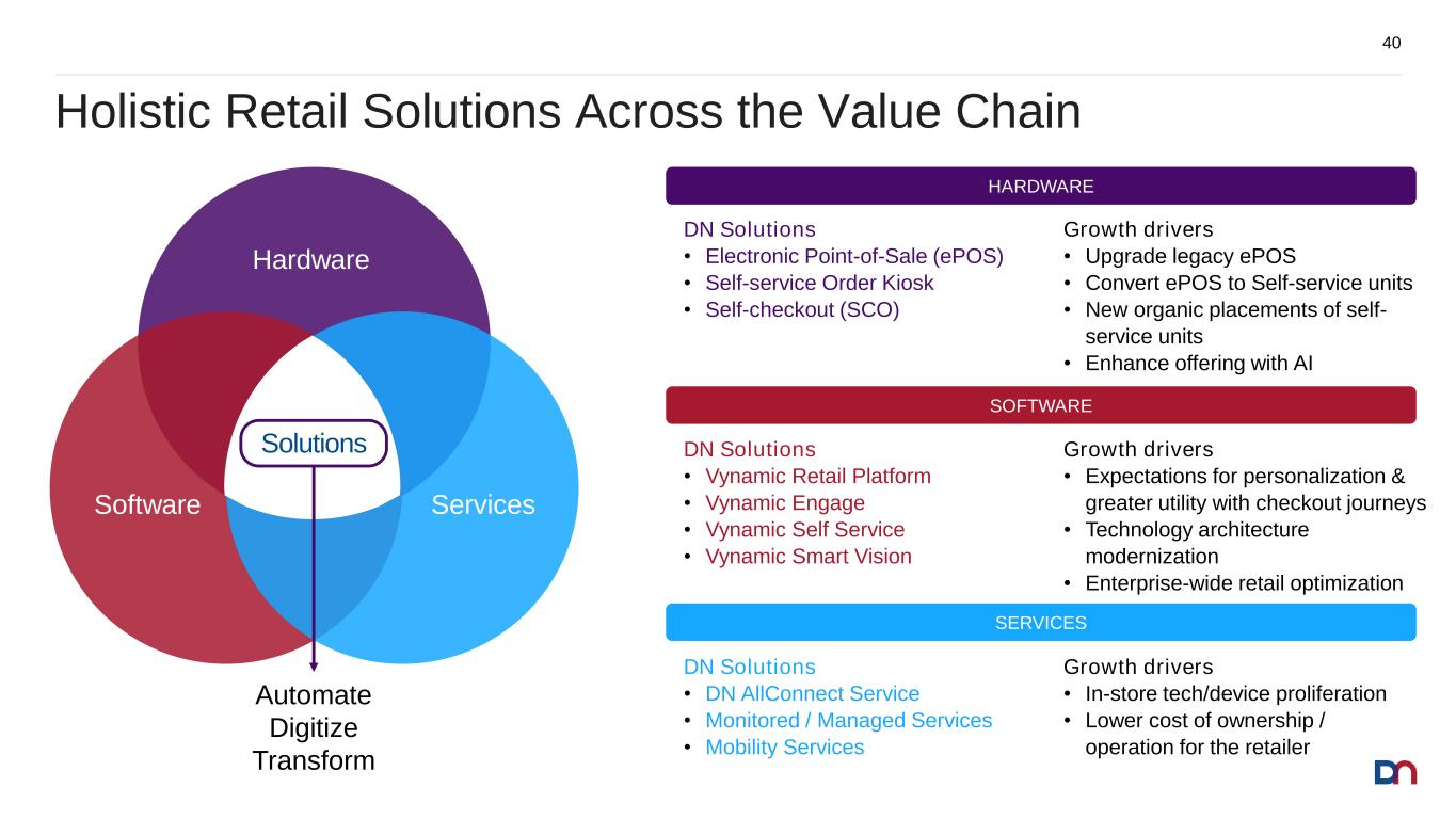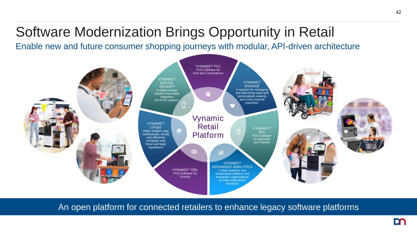 Holistic Retail Solutions Across the Value Chain 40 Software Services Hardware Solutions Automate Digitize Transform Growth drivers • In-store tech/device proliferation • Lower cost of ownership / operation for the retailer DN Solutions • DN AllConnect Service • Monitored / Managed Services • Mobility Services DN Solutions • Vynamic Retail Platform • Vynamic Engage • Vynamic Self Service • Vynamic Smart Vision Growth drivers • Expectations for personalization & greater utility with checkout journeys • Technology architecture modernization • Enterprise-wide retail optimization DN Solutions • Electronic Point-of-Sale (ePOS) • Self-service Order Kiosk • Self-checkout (SCO) Growth drivers • Upgrade legacy ePOS • Convert ePOS to Self-service units • New organic placements of self- service units • Enhance offering with AI HARDWARE SOFTWARE SERVICES