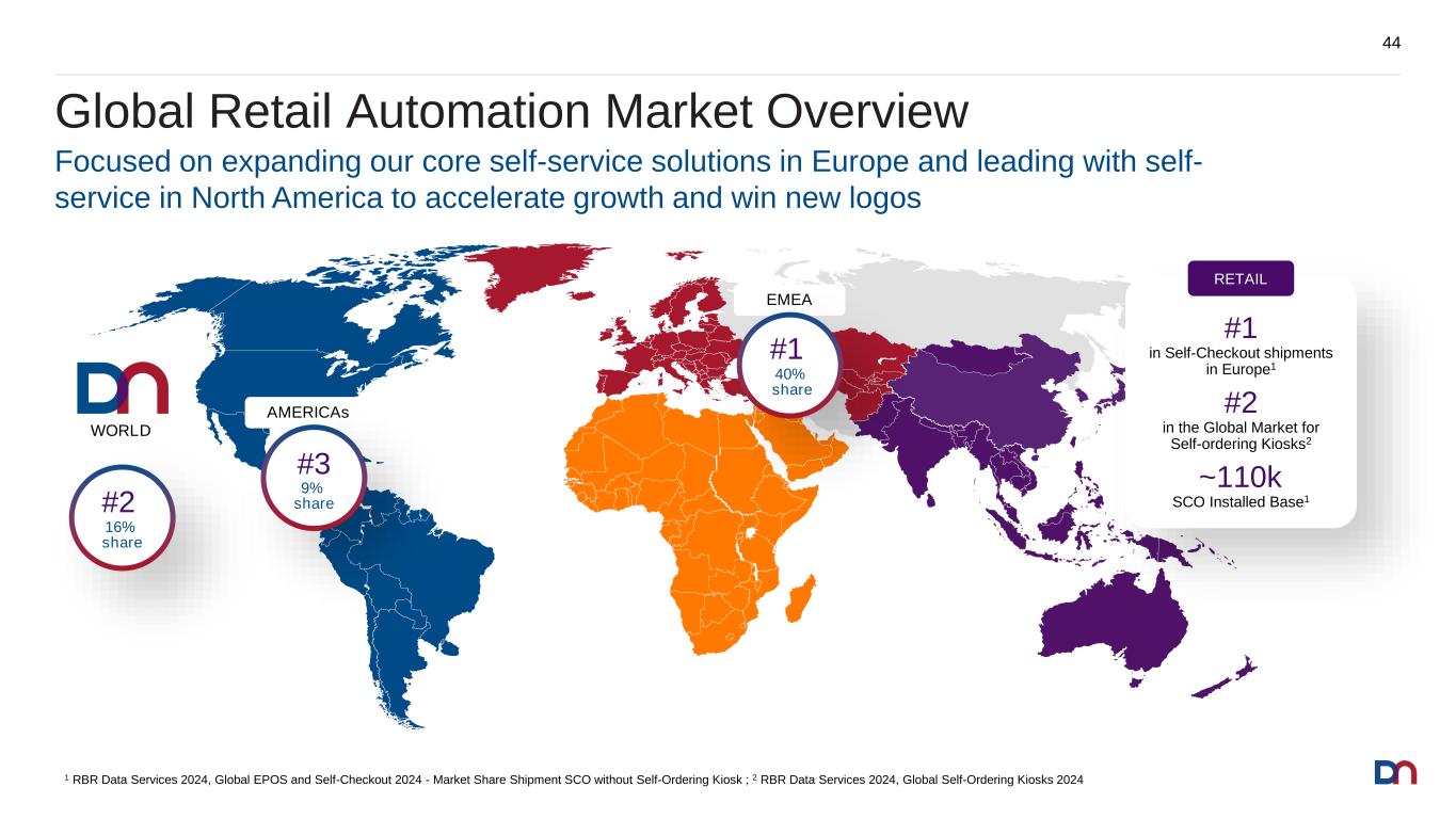 DN Services Enable Efficiency and Lower Ownership Cost 43 • Efficient field operations and improved first-time-fix through advanced call diagnostics • Preventive maintenance for risk reduction based on AI prediction • Incident resolution through proactive detection (we know before you know) • Single point of contact for multivendor support • Monitoring business-critical resiliency • AI-based prediction detects downtime risk and identifies solutions before they occur • Real-time actionable insights from tens of thousands devices globally Proactive Remote Services Predictive Remote Services Smart Local Services Majority of self-checkout shipments are new placements representing an opportunity for higher service assets under management