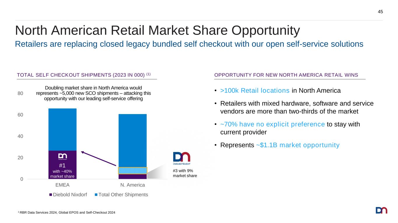 #3 21% share #2 Global Retail Automation Market Overview 44 WORLD #2 16% share #1 in Self-Checkout shipments in Europe1 #2 in the Global Market for Self-ordering Kiosks2 ~110k SCO Installed Base1 RETAIL AMERICAs #3 9% share EMEA #1 40% share Focused on expanding our core self-service solutions in Europe and leading with self- service in North America to accelerate growth and win new logos 1 RBR Data Services 2024, Global EPOS and Self-Checkout 2024 - Market Share Shipment SCO without Self-Ordering Kiosk ; 2 RBR Data Services 2024, Global Self-Ordering Kiosks 2024