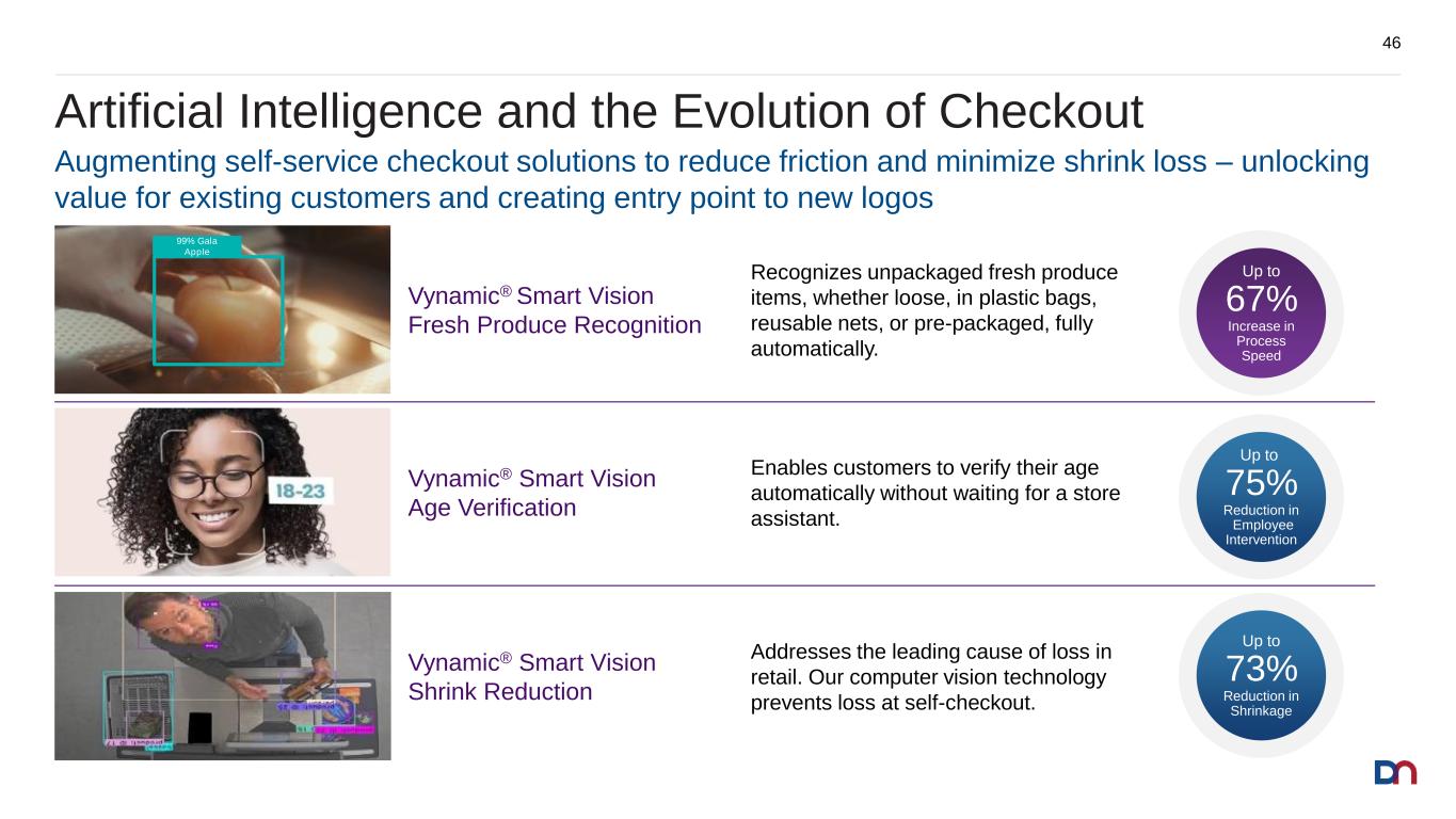 Artificial Intelligence and the Evolution of Checkout 46 Augmenting self-service checkout solutions to reduce friction and minimize shrink loss – unlocking value for existing customers and creating entry point to new logos Vynamic® Smart Vision Shrink Reduction Addresses the leading cause of loss in retail. Our computer vision technology prevents loss at self-checkout. Up to 73% Reduction in Shrinkage Vynamic® Smart Vision Fresh Produce Recognition 99% Gala Apple Recognizes unpackaged fresh produce items, whether loose, in plastic bags, reusable nets, or pre-packaged, fully automatically. Up to 67% Increase in Process Speed Vynamic® Smart Vision Age Verification Enables customers to verify their age automatically without waiting for a store assistant. Up to 75% Reduction in Employee Intervention