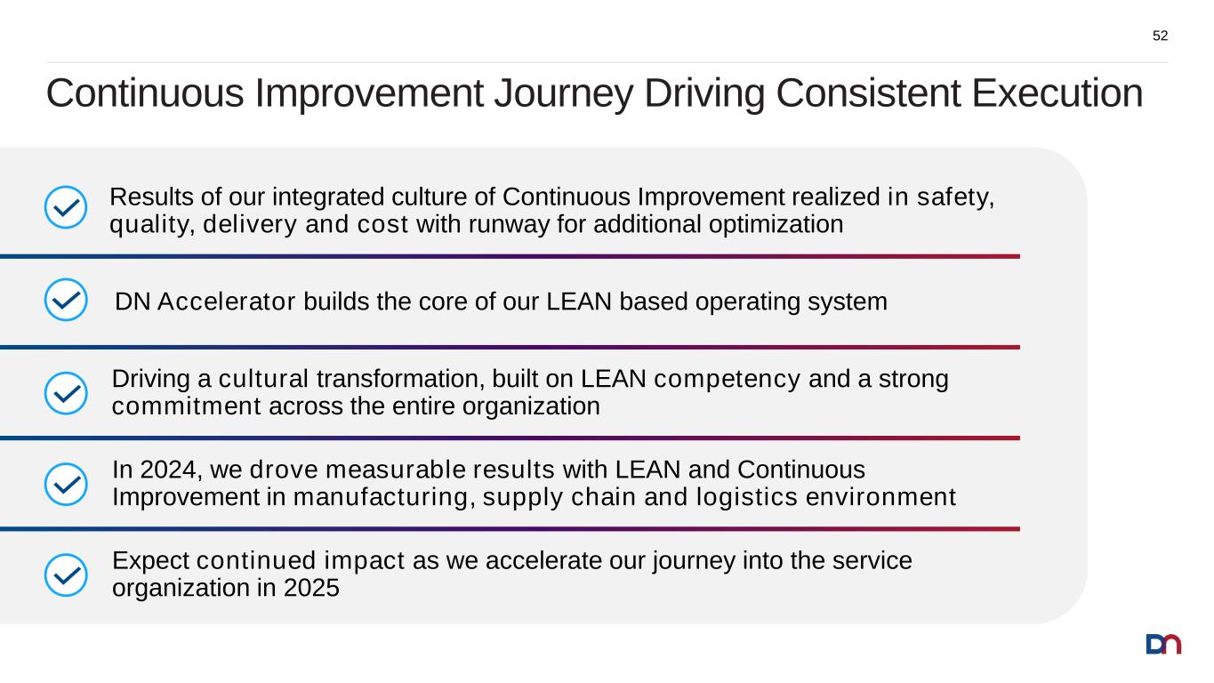 In 2024, we drove measurable results with LEAN and Continuous Improvement in manufacturing, supply chain and logistics environment Driving a cultural transformation, built on LEAN competency and a strong commitment across the entire organization Continuous Improvement Journey Driving Consistent Execution 52 Results of our integrated culture of Continuous Improvement realized in safety, quality, delivery and cost with runway for additional optimization DN Accelerator builds the core of our LEAN based operating system Expect continued impact as we accelerate our journey into the service organization in 2025