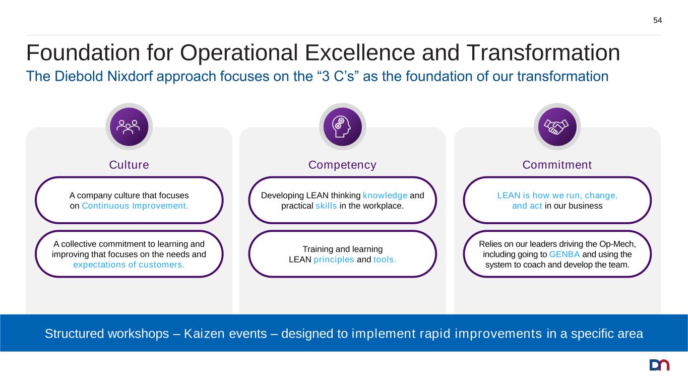 Foundation for Operational Excellence and Transformation 54 The Diebold Nixdorf approach focuses on the “3 C’s” as the foundation of our transformation CompetencyCulture Developing LEAN thinking knowledge and practical skills in the workplace. Training and learning LEAN principles and tools. A company culture that focuses on Continuous Improvement. A collective commitment to learning and improving that focuses on the needs and expectations of customers. LEAN is how we run, change, and act in our business Relies on our leaders driving the Op-Mech, including going to GENBA and using the system to coach and develop the team. Commitment Structured workshops – Kaizen events – designed to implement rapid improvements in a specific area