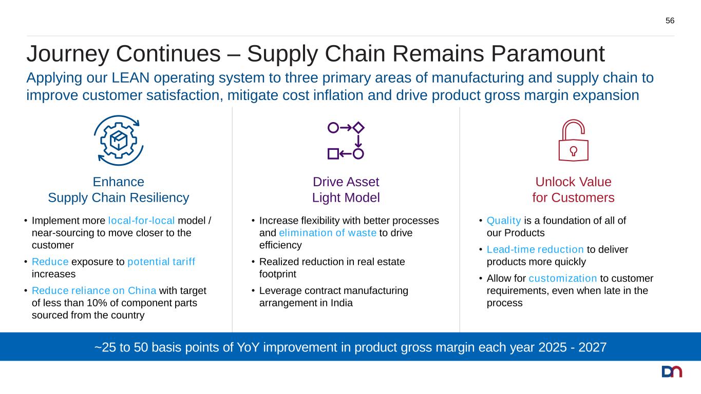 Journey Continues – Supply Chain Remains Paramount 56 Applying our LEAN operating system to three primary areas of manufacturing and supply chain to improve customer satisfaction, mitigate cost inflation and drive product gross margin expansion • Increase flexibility with better processes and elimination of waste to drive efficiency • Realized reduction in real estate footprint • Leverage contract manufacturing arrangement in India Drive Asset Light Model • Implement more local-for-local model / near-sourcing to move closer to the customer • Reduce exposure to potential tariff increases • Reduce reliance on China with target of less than 10% of component parts sourced from the country Enhance Supply Chain Resiliency • Quality is a foundation of all of our Products • Lead-time reduction to deliver products more quickly • Allow for customization to customer requirements, even when late in the process Unlock Value for Customers ~25 to 50 basis points of YoY improvement in product gross margin each year 2025 - 2027