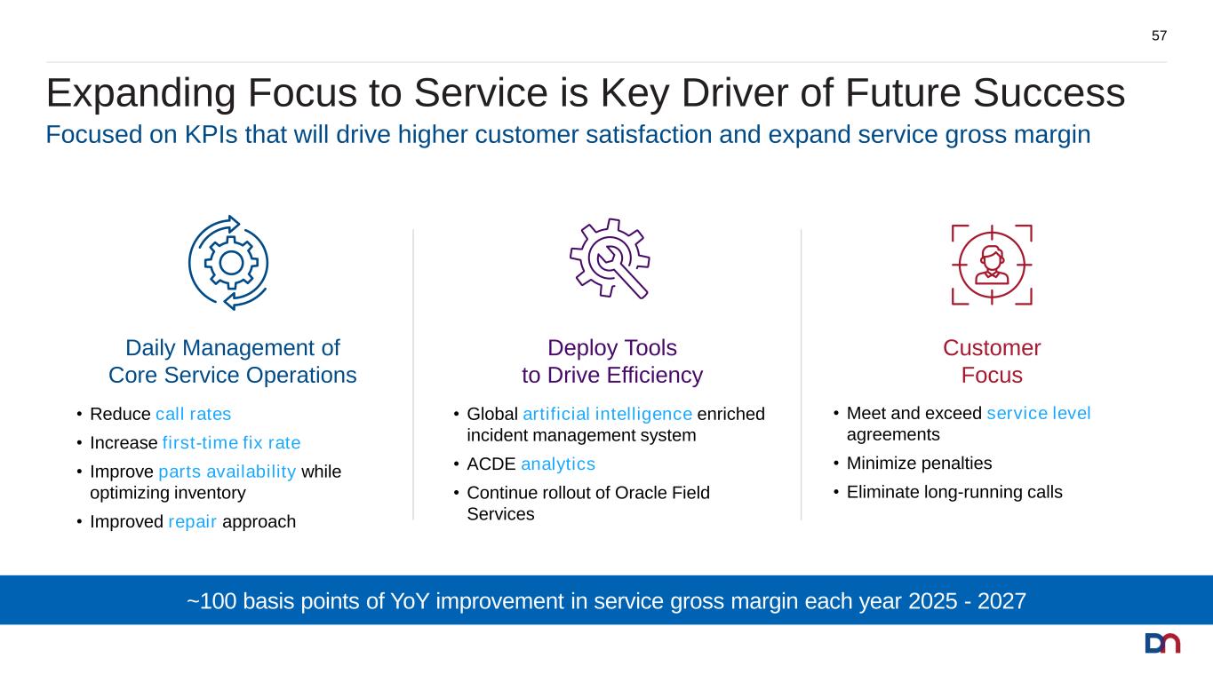 Expanding Focus to Service is Key Driver of Future Success 57 Focused on KPIs that will drive higher customer satisfaction and expand service gross margin Deploy Tools to Drive Efficiency Daily Management of Core Service Operations Customer Focus • Reduce call rates • Increase first-time fix rate • Improve parts availability while optimizing inventory • Improved repair approach • Global artificial intelligence enriched incident management system • ACDE analytics • Continue rollout of Oracle Field Services • Meet and exceed service level agreements • Minimize penalties • Eliminate long-running calls ~100 basis points of YoY improvement in service gross margin each year 2025 - 2027