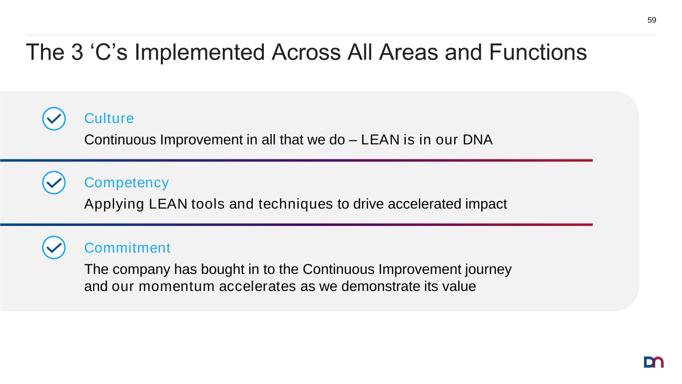 The 3 ‘C’s Implemented Across All Areas and Functions 59 Commitment The company has bought in to the Continuous Improvement journey and our momentum accelerates as we demonstrate its value Culture Continuous Improvement in all that we do – LEAN is in our DNA Competency Applying LEAN tools and techniques to drive accelerated impact