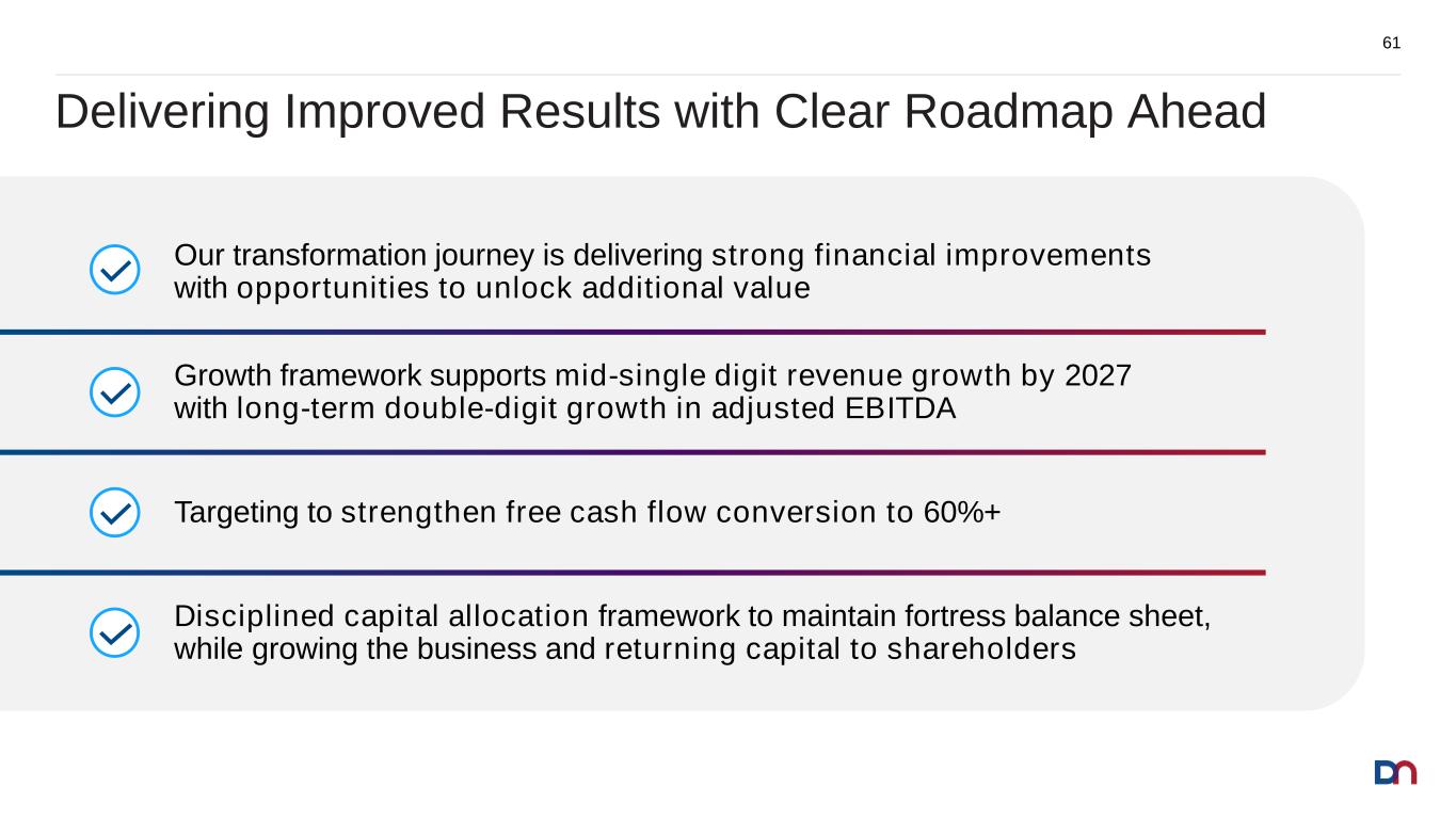 Delivering Improved Results with Clear Roadmap Ahead 61 Disciplined capital allocation framework to maintain fortress balance sheet, while growing the business and returning capital to shareholders Targeting to strengthen free cash flow conversion to 60%+ Our transformation journey is delivering strong financial improvements with opportunities to unlock additional value Growth framework supports mid-single digit revenue growth by 2027 with long-term double-digit growth in adjusted EBITDA