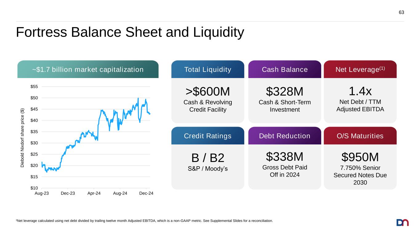 Fortress Balance Sheet and Liquidity 63 $10 $15 $20 $25 $30 $35 $40 $45 $50 $55 Aug-23 Dec-23 Apr-24 Aug-24 Dec-24 D ie b o ld N ix d o rf s h a re p ri c e ( $ ) >$600M Cash & Revolving Credit Facility Total Liquidity Cash Balance $328M Cash & Short-Term Investment Net Leverage(1) 1.4x Net Debt / TTM Adjusted EBITDA B / B2 S&P / Moody’s Credit Ratings Debt Reduction $338M Gross Debt Paid Off in 2024 O/S Maturities $950M 7.750% Senior Secured Notes Due 2030 ~$1.7 billion market capitalization 1Net leverage calculated using net debt divided by trailing twelve month Adjusted EBITDA, which is a non-GAAP metric. See Supplemental Slides for a reconciliation.