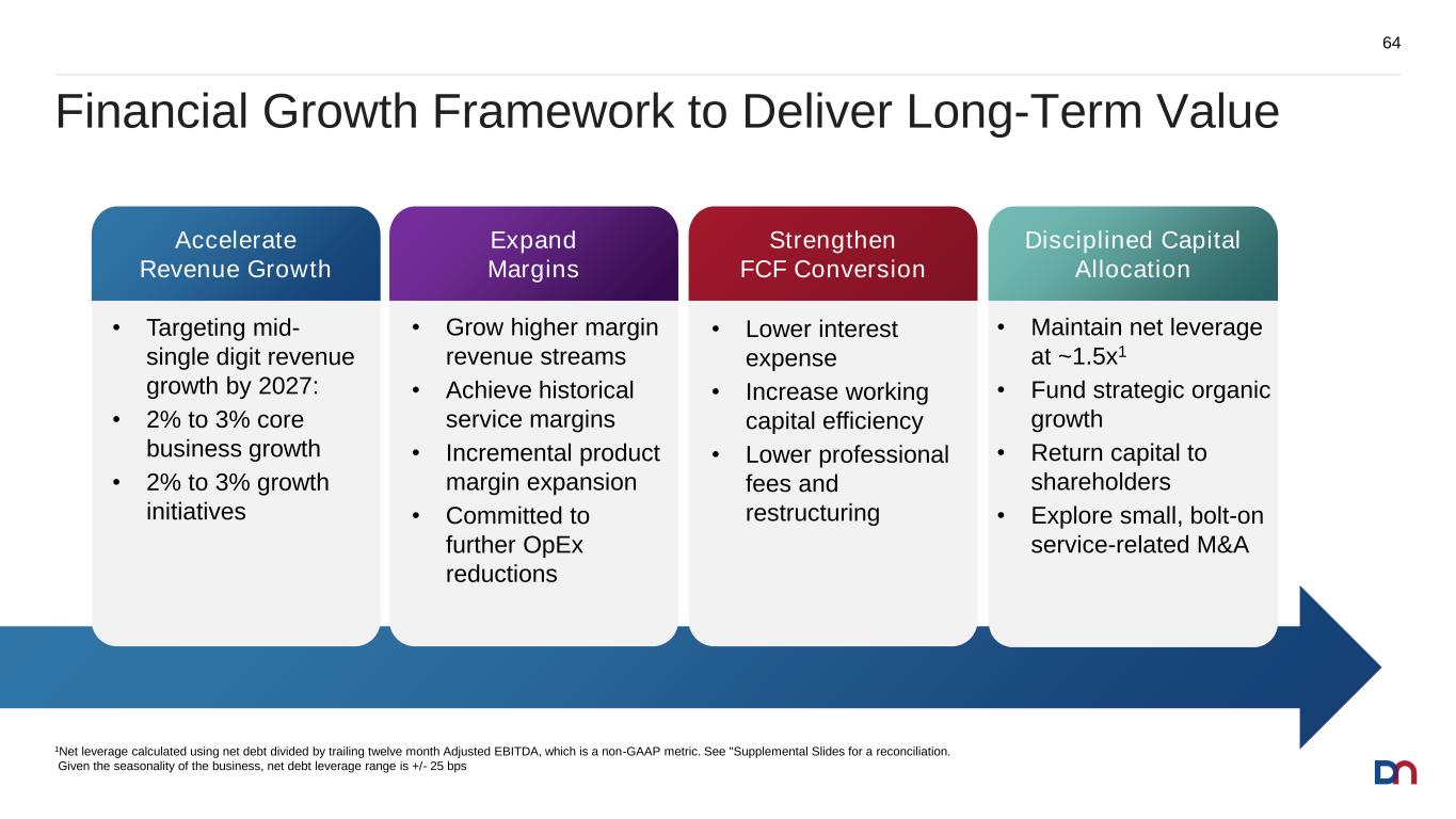 Financial Growth Framework to Deliver Long-Term Value 64 Deliver long term growth in Adj. EBITDA and FCF generation • Targeting mid- single digit revenue growth by 2027: • 2% to 3% core business growth • 2% to 3% growth initiatives Accelerate Revenue Growth • Grow higher margin revenue streams • Achieve historical service margins • Incremental product margin expansion • Committed to further OpEx reductions Expand Margins • Lower interest expense • Increase working capital efficiency • Lower professional fees and restructuring Strengthen FCF Conversion • Maintain net leverage at ~1.5x1 • Fund strategic organic growth • Return capital to shareholders • Explore small, bolt-on service-related M&A Disciplined Capital Allocation 1Net leverage calculated using net debt divided by trailing twelve month Adjusted EBITDA, which is a non-GAAP metric. See "Supplemental Slides for a reconciliation. Given the seasonality of the business, net debt leverage range is +/- 25 bps