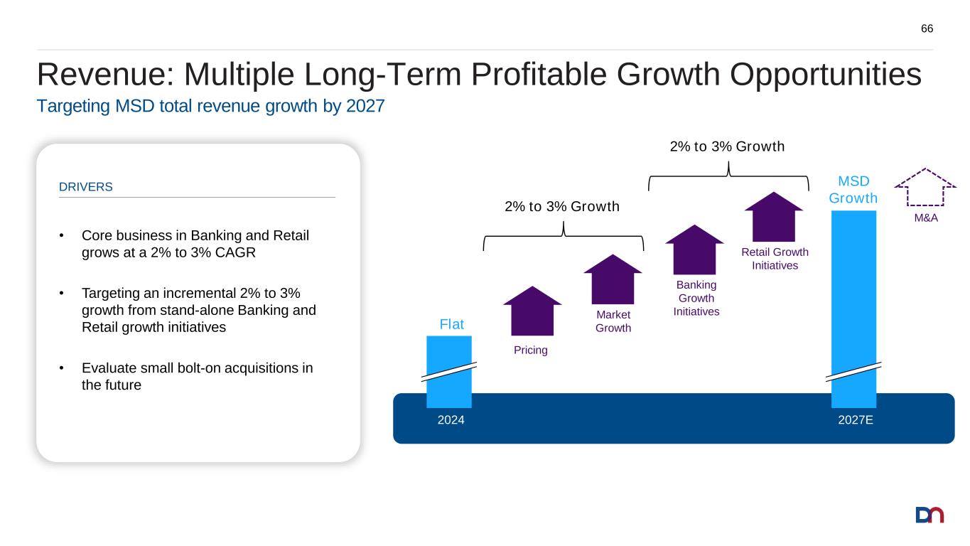 Revenue: Multiple Long-Term Profitable Growth Opportunities 66 2027E2024 Targeting MSD total revenue growth by 2027 DRIVERS $XXX Retail Growth Initiatives Pricing $XXX Banking Growth InitiativesMarket GrowthFlat MSD Growth • Core business in Banking and Retail grows at a 2% to 3% CAGR • Targeting an incremental 2% to 3% growth from stand-alone Banking and Retail growth initiatives • Evaluate small bolt-on acquisitions in the future M&A 2% to 3% Growth 2% to 3% Growth