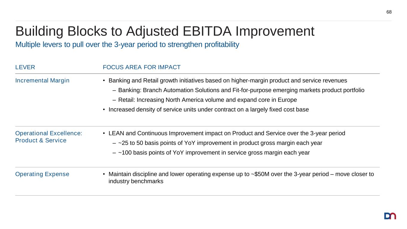 Building Blocks to Adjusted EBITDA Improvement 68 Multiple levers to pull over the 3-year period to strengthen profitability LEVER FOCUS AREA FOR IMPACT Incremental Margin • Banking and Retail growth initiatives based on higher-margin product and service revenues ‒ Banking: Branch Automation Solutions and Fit-for-purpose emerging markets product portfolio ‒ Retail: Increasing North America volume and expand core in Europe • Increased density of service units under contract on a largely fixed cost base Operational Excellence: Product & Service • LEAN and Continuous Improvement impact on Product and Service over the 3-year period ‒ ~25 to 50 basis points of YoY improvement in product gross margin each year ‒ ~100 basis points of YoY improvement in service gross margin each year Operating Expense • Maintain discipline and lower operating expense up to ~$50M over the 3-year period – move closer to industry benchmarks