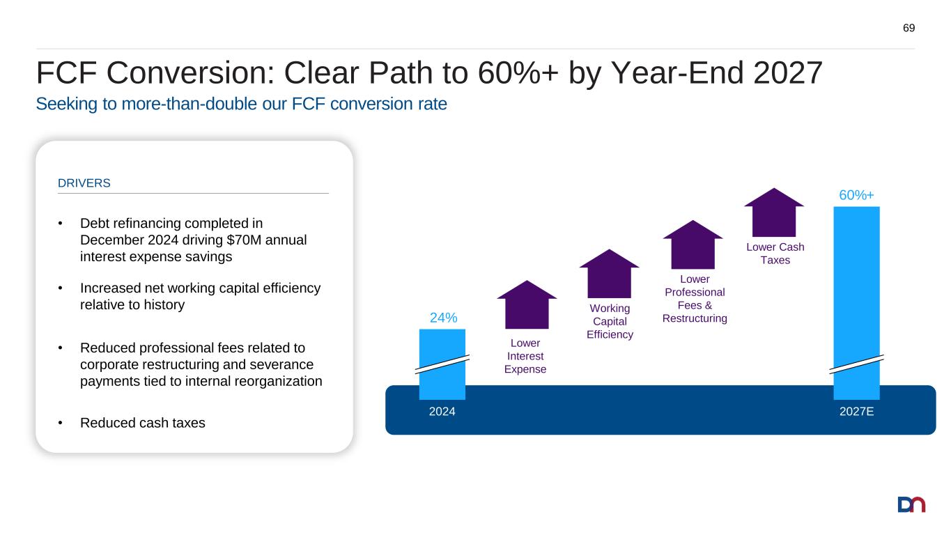 FCF Conversion: Clear Path to 60%+ by Year-End 2027 69 2027E2024 • Debt refinancing completed in December 2024 driving $70M annual interest expense savings • Increased net working capital efficiency relative to history • Reduced professional fees related to corporate restructuring and severance payments tied to internal reorganization • Reduced cash taxes Seeking to more-than-double our FCF conversion rate DRIVERS $XXX Lower Cash Taxes Lower Interest Expense $XXX Lower Professional Fees & Restructuring Working Capital Efficiency 24% 60%+