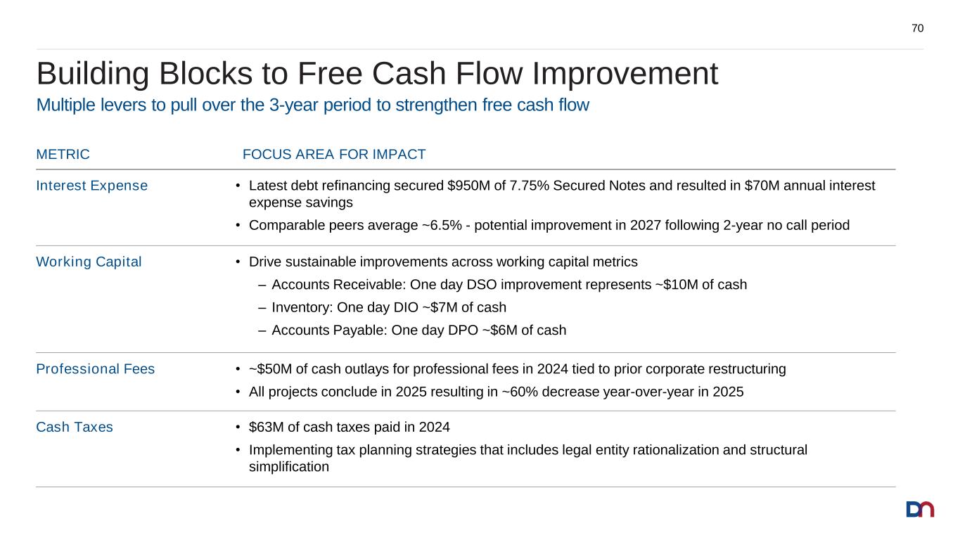 METRIC FOCUS AREA FOR IMPACT Interest Expense • Latest debt refinancing secured $950M of 7.75% Secured Notes and resulted in $70M annual interest expense savings • Comparable peers average ~6.5% - potential improvement in 2027 following 2-year no call period Working Capital • Drive sustainable improvements across working capital metrics ‒ Accounts Receivable: One day DSO improvement represents ~$10M of cash ‒ Inventory: One day DIO ~$7M of cash ‒ Accounts Payable: One day DPO ~$6M of cash Professional Fees • ~$50M of cash outlays for professional fees in 2024 tied to prior corporate restructuring • All projects conclude in 2025 resulting in ~60% decrease year-over-year in 2025 Cash Taxes • $63M of cash taxes paid in 2024 • Implementing tax planning strategies that includes legal entity rationalization and structural simplification Building Blocks to Free Cash Flow Improvement 70 Multiple levers to pull over the 3-year period to strengthen free cash flow