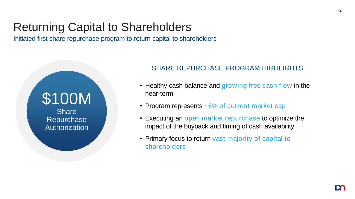 Returning Capital to Shareholders 72 Initiated first share repurchase program to return capital to shareholders SHARE REPURCHASE PROGRAM HIGHLIGHTS • Healthy cash balance and growing free cash flow in the near-term • Program represents ~6% of current market cap • Executing an open market repurchase to optimize the impact of the buyback and timing of cash availability • Primary focus to return vast majority of capital to shareholders $100M Share Repurchase Authorization