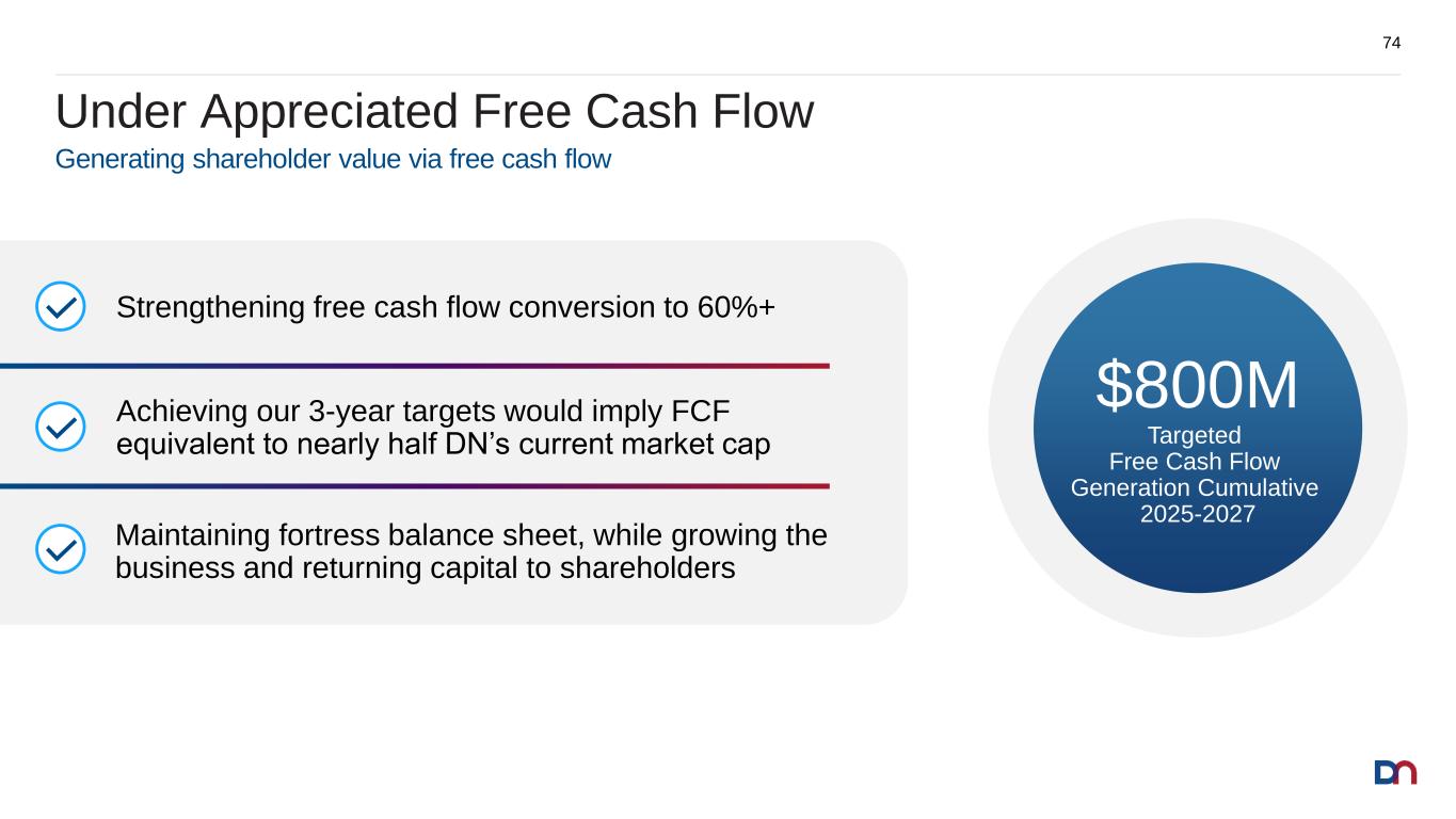 Under Appreciated Free Cash Flow 74 Generating shareholder value via free cash flow Maintaining fortress balance sheet, while growing the business and returning capital to shareholders Strengthening free cash flow conversion to 60%+ Achieving our 3-year targets would imply FCF equivalent to nearly half DN’s current market cap $800M Targeted Free Cash Flow Generation Cumulative 2025-2027