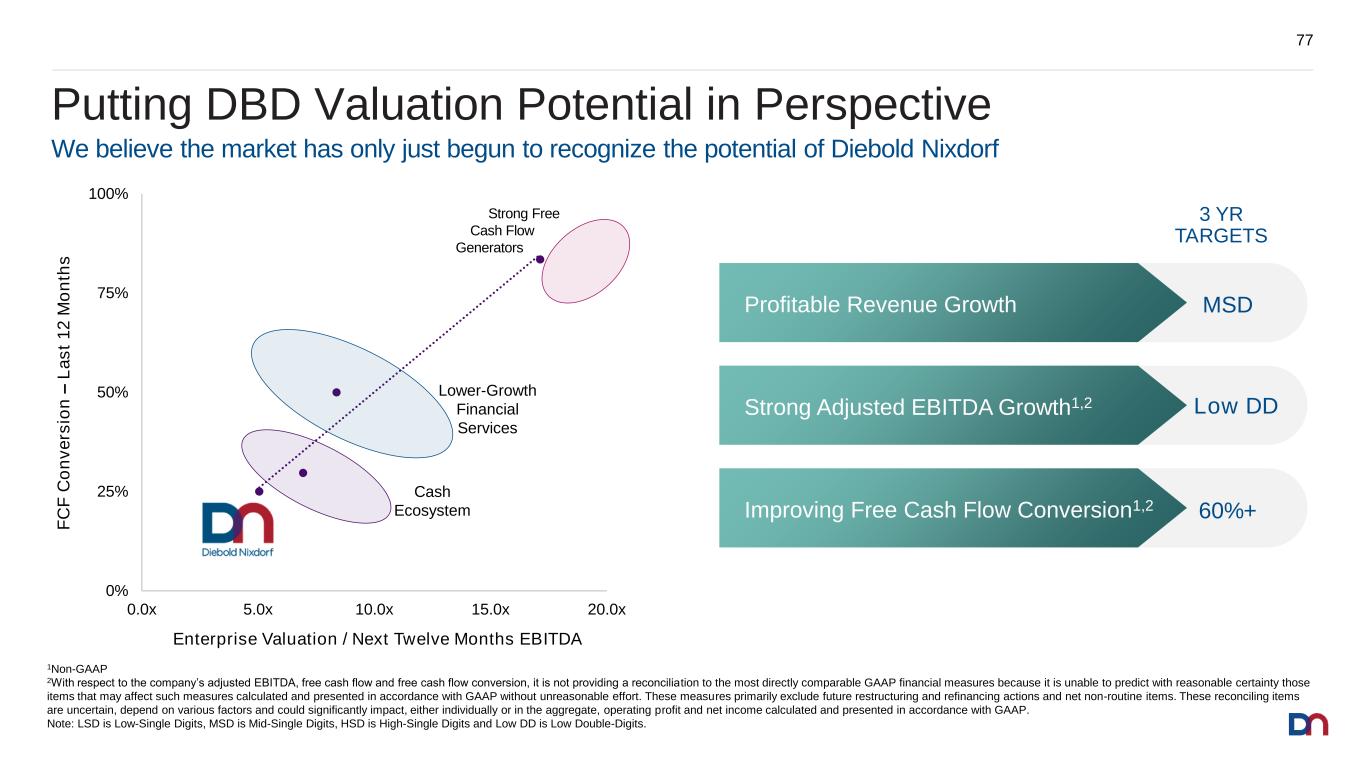 Diebold Nixdorf Investment Thesis 76 Delivering value creation across three key drivers Well positioned to capitalize on growing TAMs, AI integration trends and shifting consumer preference to self-service in Banking and Retail Capturing Secular Tailwinds We are in the initial stages of our LEAN journey driving significant profitability improvement and expanding efforts across the company Driving Growth & Profitability We plan to deliver significant and growing FCF conversion which enables further investment for growth and increased shareholder return Increasing Cash Generation Targeting annual double-digit adjusted EBITDA growth by 2027 & 60%+ FCF conversion
