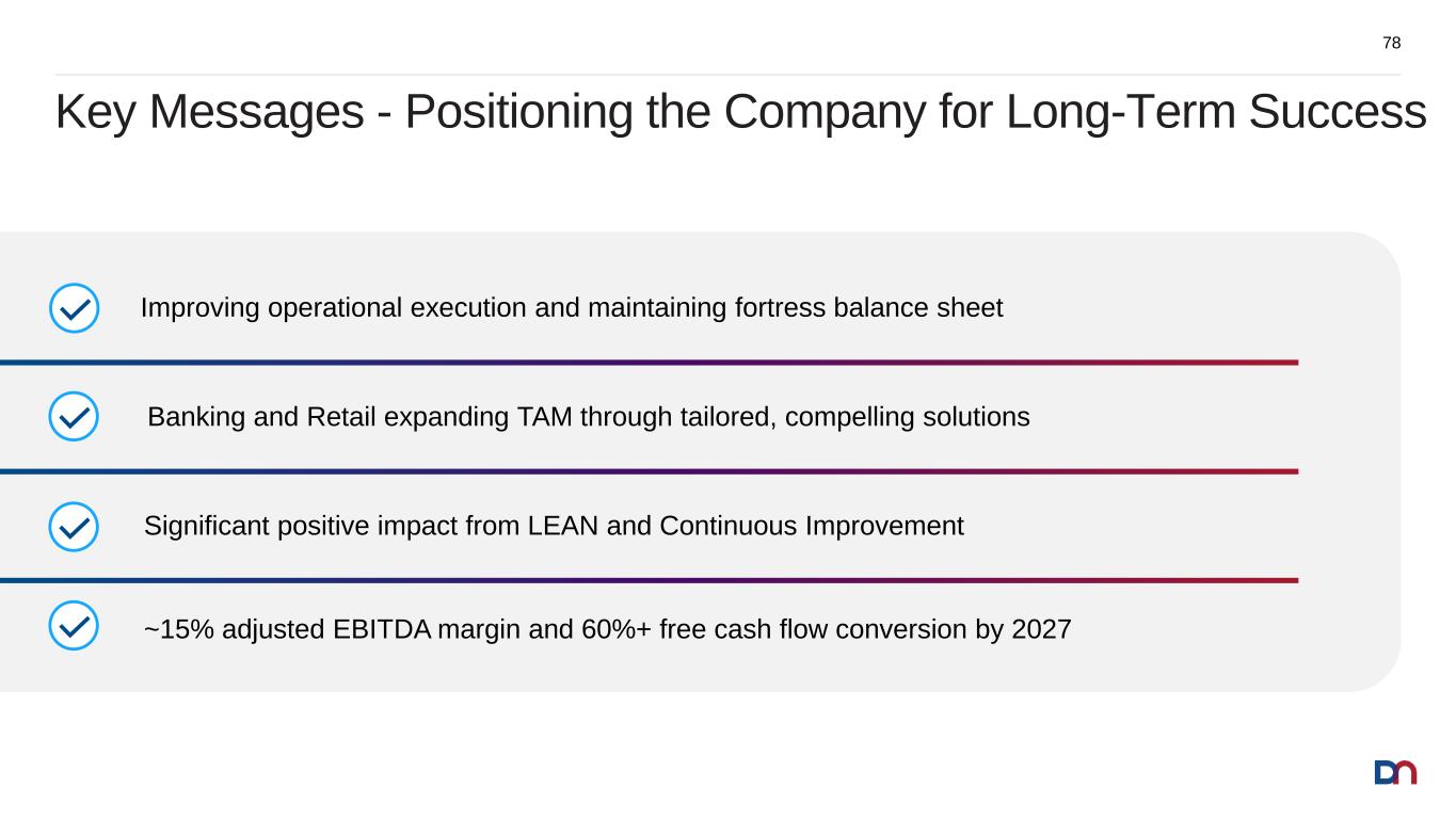 Significant positive impact from LEAN and Continuous Improvement Key Messages - Positioning the Company for Long-Term Success 78 Improving operational execution and maintaining fortress balance sheet Banking and Retail expanding TAM through tailored, compelling solutions ~15% adjusted EBITDA margin and 60%+ free cash flow conversion by 2027