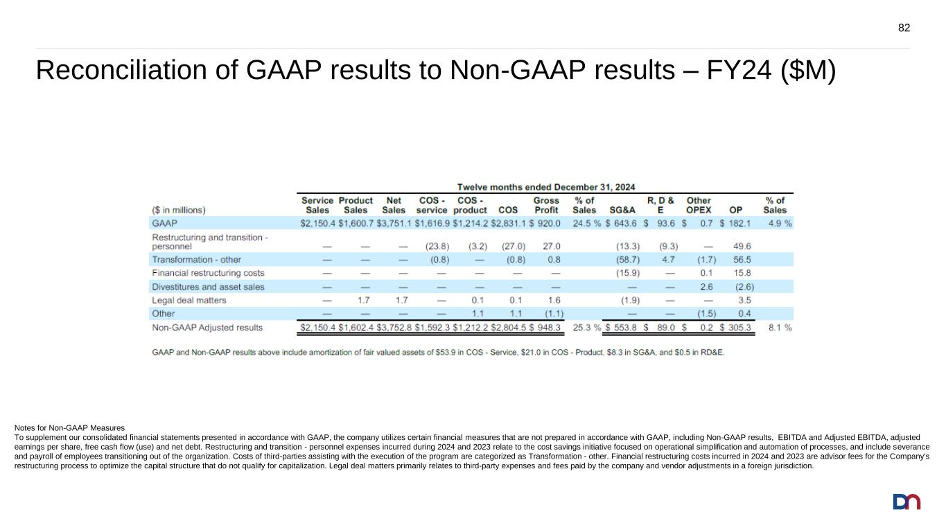 Reconciliation of GAAP results to Non-GAAP results – FY24 ($M) 82 Notes for Non-GAAP Measures To supplement our consolidated financial statements presented in accordance with GAAP, the company utilizes certain financial measures that are not prepared in accordance with GAAP, including Non-GAAP results, EBITDA and Adjusted EBITDA, adjusted earnings per share, free cash flow (use) and net debt. Restructuring and transition - personnel expenses incurred during 2024 and 2023 relate to the cost savings initiative focused on operational simplification and automation of processes, and include severance and payroll of employees transitioning out of the organization. Costs of third-parties assisting with the execution of the program are categorized as Transformation - other. Financial restructuring costs incurred in 2024 and 2023 are advisor fees for the Company's restructuring process to optimize the capital structure that do not qualify for capitalization. Legal deal matters primarily relates to third-party expenses and fees paid by the company and vendor adjustments in a foreign jurisdiction.