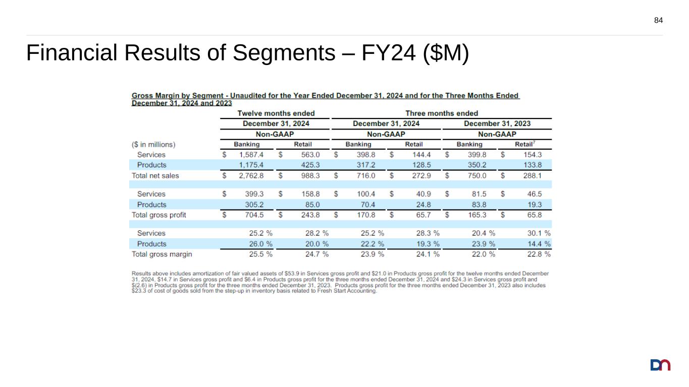 Reconciliation of GAAP net income to EBITDA and Adjusted EBITDA – FY24 ($M) 83 The company defines EBITDA as net income (loss) excluding income tax benefit (expense), net interest expense, and depreciation and amortization expense. Adjusted EBITDA is EBITDA excluding the effects of the following items: share-based compensation, amortization of cloud-based software implementation costs, foreign exchange gain/loss net, miscellaneous net, equity in earnings of unconsolidated subsidiaries, restructuring and transformation expenses, refinancing related costs, non-routine expenses, and reorganization items, net as outlined in Note 1 of the Non-GAAP measures. Deferred financing fee amortization is included in interest expense; as a result, the company has excluded such fees from the depreciation and amortization caption. Depreciation and amortization expense was excluded from held for sale non-core business. Amortization of cloud-based software implementation represents amortization of capitalized implementation costs related to cloud-based software arrangements that are included in selling and administrative expenses but are not considered GAAP depreciation and amortization. Reorganization items, net includes all income, expenses, gains, or losses that are incurred or realized as a result of the restructuring proceedings. These are Non-GAAP financial measures used by management to enhance the understanding of our operating results. EBITDA and Adjusted EBITDA are key measures we use to evaluate our operational performance. We provide EBITDA and Adjusted EBITDA because we believe that investors and securities analysts will find EBITDA and Adjusted EBITDA to be useful measures for evaluating our operating performance and comparing our operating performance with that of similar companies that have different capital structures and for evaluating our ability to meet our future debt service, capital expenditures, and working capital requirements. However, EBITDA and Adjusted EBITDA should not be considered as alternatives to net income as a measure of operating results or as alternatives to cash flows from operating activities as a measure of liquidity in accordance with GAAP.