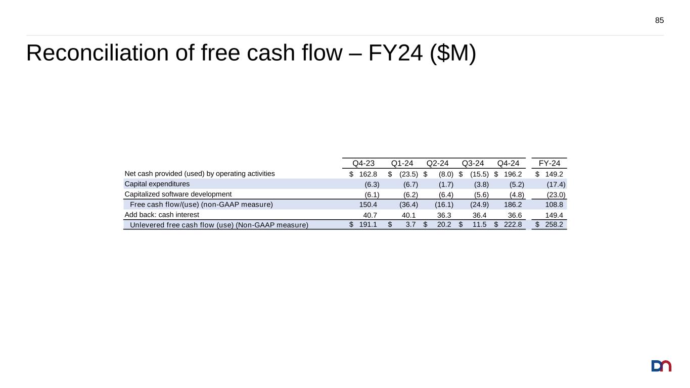 Reconciliation of free cash flow – FY24 ($M) 85 Q4-23 Q1-24 Q2-24 Q3-24 Q4-24 FY-24 Net cash provided (used) by operating activities 162.8$ (23.5)$ (8.0)$ (15.5)$ 196.2$ 149.2$ Capital expenditures (6.3) (6.7) (1.7) (3.8) (5.2) (17.4) Capitalized software development (6.1) (6.2) (6.4) (5.6) (4.8) (23.0) Free cash flow/(use) (non-GAAP measure) 150.4 (36.4) (16.1) (24.9) 186.2 108.8 Add back: cash interest 40.7 40.1 36.3 36.4 36.6 149.4 Unlevered free cash flow (use) (Non-GAAP measure) 191.1$ 3.7$ 20.2$ 11.5$ 222.8$ 258.2$