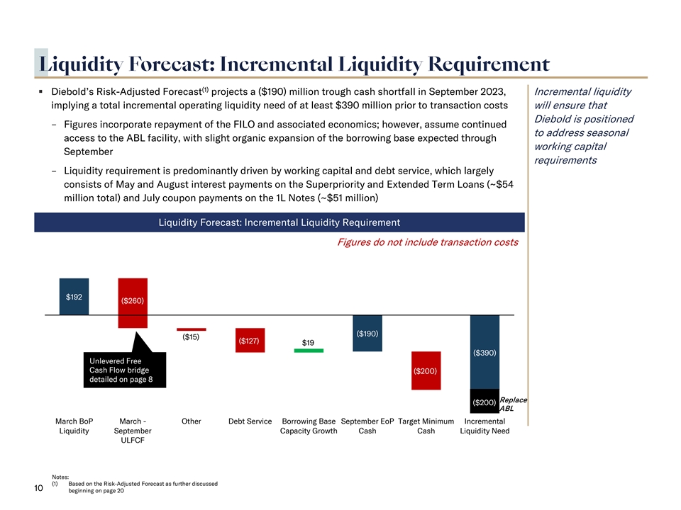 Liquidity Forecast: Unlevered Free Cash Flow Bridge § As Diebold approaches its seasonal liquidity trough in September, it will continue to burn cash on an Given the seasonality unlevered basis as it builds working capital and simultaneously seeks to manage supplier relationships of Diebold’s business, and work through a large deferred revenue balance peak to trough liquidity requirements are high (1) § While the business is projected to generate over $200 million Adjusted EBITDA from March through September 2023, working capital requirements more than offset profitability due to: – Seasonal high point for accounts receivable and inventory balances – High deferred revenue balance at the end of February leads to lower cash conversion as deferred revenue unwinds (1) March – September 2023 Unlevered Free Cash Flow (Risk-Adjusted Forecast ) March to September Unlevered Free Cash Flow projected to be ($275) million incorporating other ($207) variances $203 ($67) ($65) ($260) ($57) ($31) ($47) ($27) $39 Adjusted Deferred Inventory Accounts Accounts Rx / Refi CapEx Taxes Other ULFCF EBITDA Revenue Payable Receivable Costs Notes: (1) Based on the Risk-Adjusted Forecast as further discussed 9 beginning on page 20