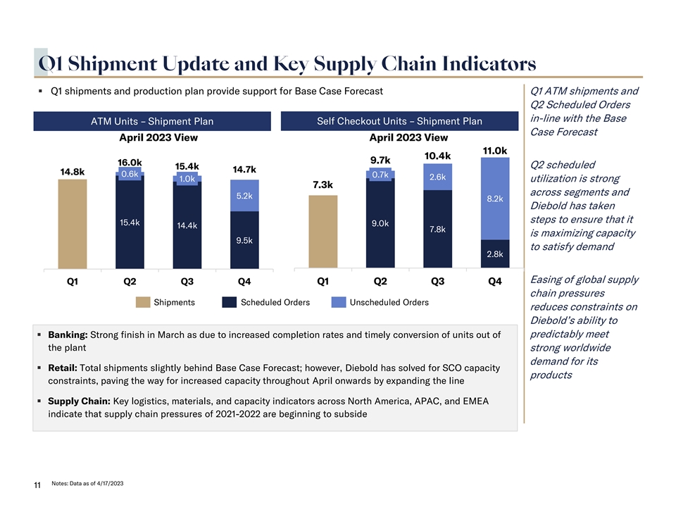Q1 Shipment Update and Key Supply Chain Indicators § Q1 shipments and production plan provide support for Base Case Forecast Q1 ATM shipments and Q2 Scheduled Orders in-line with the Base ATM Units – Shipment Plan Self Checkout Units – Shipment Plan Case Forecast April 2023 View April 2023 View 11.0k 10.4k 9.7k 16.0k Q2 scheduled 15.4k 14.7k 14.8k 0.6k 0.7k 2.6k 1.0k utilization is strong 7.3k across segments and 5.2k 8.2k Diebold has taken steps to ensure that it 15.4k 9.0k 14.4k 7.8k is maximizing capacity 9.5k to satisfy demand 2.8k Easing of global supply Q1 Q2 Q3 Q4 Q1 Q2 Q3 Q4 chain pressures Shipments Scheduled Orders Unscheduled Orders reduces constraints on Diebold’s ability to § Banking: Strong finish in March as due to increased completion rates and timely conversion of units out of predictably meet the plant strong worldwide demand for its § Retail: Total shipments slightly behind Base Case Forecast; however, Diebold has solved for SCO capacity products constraints, paving the way for increased capacity throughout April onwards by expanding the line § Supply Chain: Key logistics, materials, and capacity indicators across North America, APAC, and EMEA indicate that supply chain pressures of 2021-2022 are beginning to subside Notes: Data as of 4/17/2023 11