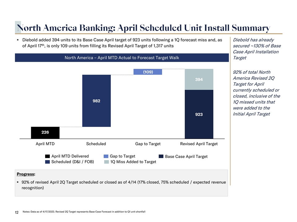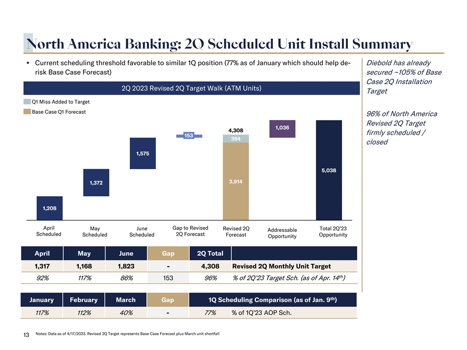 North America Banking: April Scheduled Unit Install Summary § Diebold added 394 units to its Base Case April target of 923 units following a 1Q forecast miss and, as Diebold has already th of April 17 , is only 109 units from filling its Revised April Target of 1,317 units secured ~130% of Base Case April Installation North America – April MTD Actual to Forecast Target Walk Target (109) 92% of total North America Revised 2Q 394 Target for April currently scheduled or closed, inclusive of the 982 1Q missed units that were added to the Initial April Target 923 226 April MTD Scheduled Gap to Target Revised April Target April MTD Delivered Gap to Target Base Case April Target Scheduled (D&I / FOB) 1Q Miss Added to Target Progress: § 92% of revised April 2Q Target scheduled or closed as of 4/14 (17% closed, 75% scheduled / expected revenue recognition) Notes: Data as of 4/17/2023. Revised 2Q Target represents Base Case Forecast in addition to Q1 unit shortfall 12