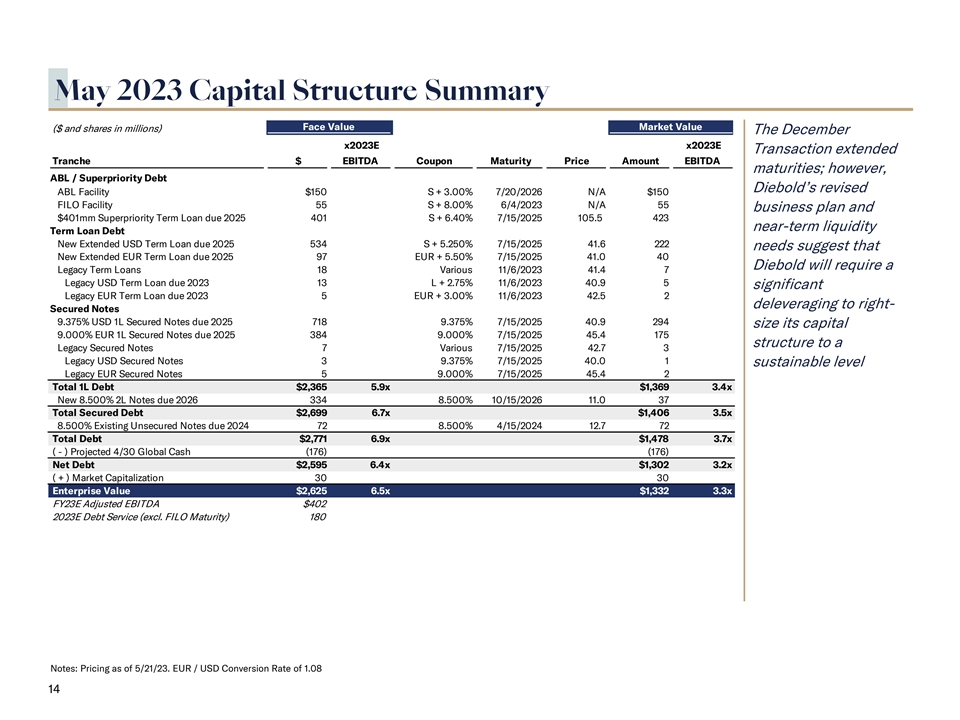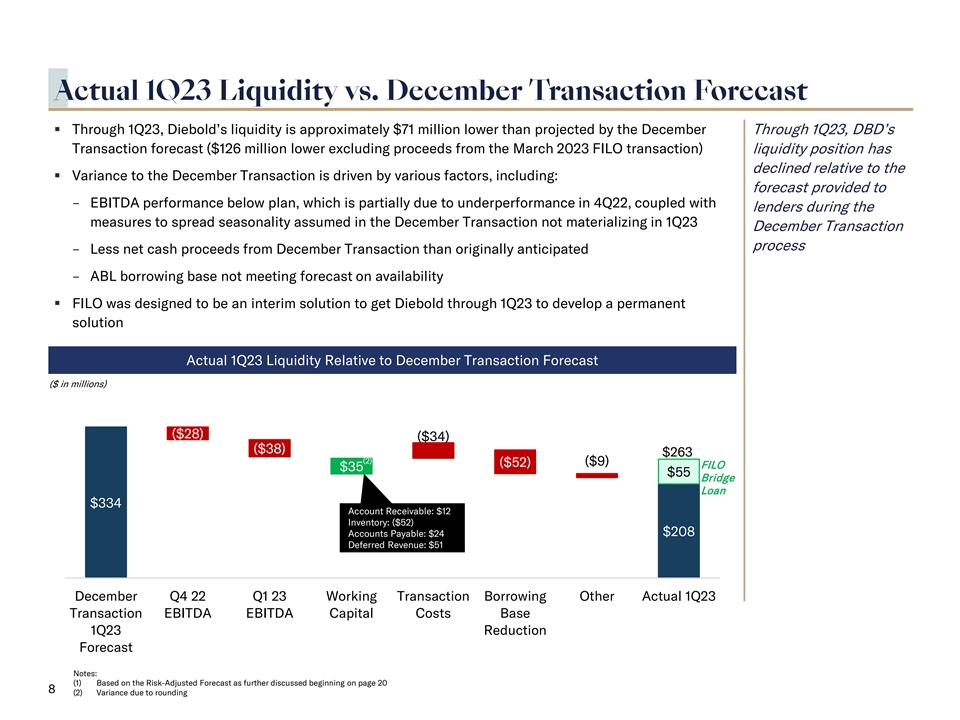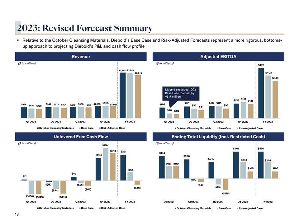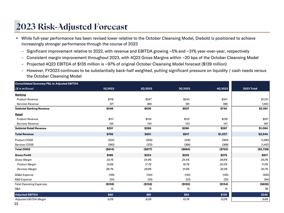 2023 Risk-Adjusted Forecast § While full-year performance has been revised lower relative to the October Cleansing Model, Diebold is positioned to achieve increasingly stronger performance through the course of 2023 – Significant improvement relative to 2022, with revenue and EBITDA growing ~5% and ~31% year-over-year, respectively – Consistent margin improvement throughout 2023, with 4Q23 Gross Margins within ~20 bps of the October Cleansing Model – Projected 4Q23 EBITDA of $135 million is ~97% of original October Cleansing Model forecast ($139 million) – However, FY2023 continues to be substantially back-half weighted, putting significant pressure on liquidity / cash needs versus the October Cleansing Model Consolidated Summary P&L to Adjusted EBITDA ($ in millions) 1Q 2023 2Q 2023 3Q 2023 4Q 2023 2023 Total Banking Product Revenue $178 $247 $245 $341 $1,011 Services Revenue 371 389 391 399 1,550 Subtotal Banking Revenue $548 $636 $637 $740 $2,561 Retail Product Revenue $117 $124 $137 $139 $517 Services Revenue 134 142 143 147 567 Subtotal Retail Revenue $251 $266 $280 $287 $1,084 Total Revenue $799 $901 $917 $1,027 $3,644 Product COGS (254) (305) (318) (383) (1,260) Services COGS (360) (372) (366) (369) (1,467) Total COGS ($614) ($677) ($684) ($752) ($2,728) Gross Profit $185 $224 $233 $275 $917 Gross Margin 23.1% 24.9% 25.4% 26.8% 25.2% Product Margin 13.6% 17.7% 16.7% 20.4% 17.5% Services Margin 28.7% 29.9% 31.6% 32.3% 30.7% SG&A Expense (135) (134) (132) (132) (532) R&D Expense (24) (25) (23) (22) (94) Total Operating Expenses ($159) ($158) ($155) ($154) ($626) D&A 14 15 15 14 58 Adjusted EBITDA $40 $81 $93 $135 $349 Adjusted EBITDA Margin 5.0% 9.0% 10.1% 13.2% 9.6% 22