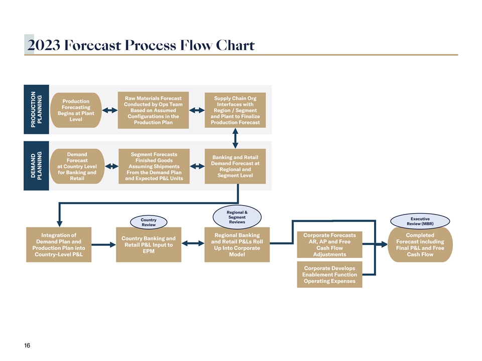 2023 Forecast Process Flow Chart Raw Materials Forecast Supply Chain Org Production Conducted by Ops Team Interfaces with Forecasting Based on Assumed Region / Segment Begins at Plant Configurations in the and Plant to Finalize Level Production Plan Production Forecast Demand Segment Forecasts Banking and Retail Forecast Finished Goods Demand Forecast at at Country Level Assuming Shipments Regional and for Banking and From the Demand Plan Segment Level Retail and Expected P&L Units Regional & Segment Executive Country Reviews Review (MBR) Review Integration of Regional Banking Corporate Forecasts Completed Country Banking and Demand Plan and and Retail P&Ls Roll AR, AP and Free Forecast including Retail P&L Input to Production Plan into Up Into Corporate Cash Flow Final P&L and Free EPM Adjustments Country-Level P&L Model Cash Flow Corporate Develops Enablement Function Operating Expenses 16 DEMAND PRODUCTION PLANNING PLANNING