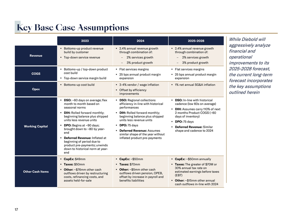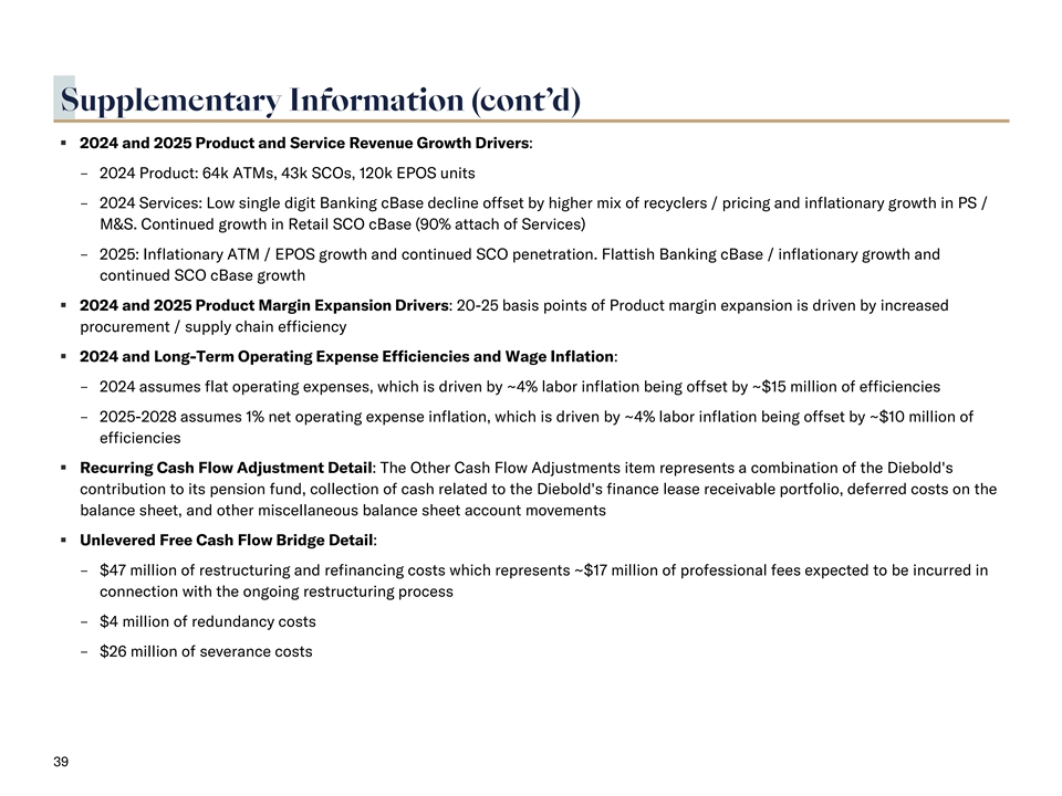 Supplementary Information (cont’d) § 2024 and 2025 Product and Service Revenue Growth Drivers: – 2024 Product: 64k ATMs, 43k SCOs, 120k EPOS units – 2024 Services: Low single digit Banking cBase decline offset by higher mix of recyclers / pricing and inflationary growth in PS / M&S. Continued growth in Retail SCO cBase (90% attach of Services) – 2025: Inflationary ATM / EPOS growth and continued SCO penetration. Flattish Banking cBase / inflationary growth and continued SCO cBase growth § 2024 and 2025 Product Margin Expansion Drivers: 20-25 basis points of Product margin expansion is driven by increased procurement / supply chain efficiency § 2024 and Long-Term Operating Expense Efficiencies and Wage Inflation: – 2024 assumes flat operating expenses, which is driven by ~4% labor inflation being offset by ~$15 million of efficiencies – 2025-2028 assumes 1% net operating expense inflation, which is driven by ~4% labor inflation being offset by ~$10 million of efficiencies § Recurring Cash Flow Adjustment Detail: The Other Cash Flow Adjustments item represents a combination of the Diebold's contribution to its pension fund, collection of cash related to the Diebold's finance lease receivable portfolio, deferred costs on the balance sheet, and other miscellaneous balance sheet account movements § Unlevered Free Cash Flow Bridge Detail: – $47 million of restructuring and refinancing costs which represents ~$17 million of professional fees expected to be incurred in connection with the ongoing restructuring process – $4 million of redundancy costs – $26 million of severance costs 39