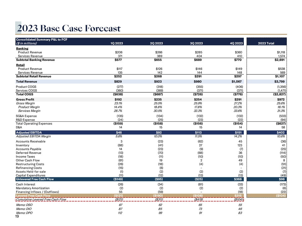 2023 Base Case Forecast Consolidated Summary P&L to FCF § Summary monthly output (condense where possible) ($ in millions) 1Q 2023 2Q 2023 3Q 2023 4Q 2023 2023 Total Banking Product Revenue $206 $266 $285 $360 $1,118 Services Revenue 371 389 404 410 1,574 Subtotal Banking Revenue $577 $655 $689 $770 $2,691 Retail Product Revenue $117 $126 $146 $149 $538 Services Revenue 135 142 144 148 569 Subtotal Retail Revenue $252 $268 $291 $297 $1,107 Total Revenue $829 $923 $980 $1,067 $3,799 Product COGS (277) (318) (355) (406) (1,356) Services COGS (360) (369) (371) (371) (1,471) Total COGS ($638) ($687) ($726) ($776) ($2,827) Gross Profit $192 $235 $254 $291 $972 Gross Margin 23.1% 25.5% 25.9% 27.2% 25.6% Product Margin 14.4% 18.8% 17.8% 20.3% 18.1% Services Margin 28.7% 30.5% 32.3% 33.6% 31.3% SG&A Expense (135) (134) (132) (132) (533) R&D Expense (24) (25) (23) (22) (94) Total Operating Expenses ($159) ($158) ($156) ($154) ($627) D&A 14 15 15 14 58 Adjusted EBITDA $46 $92 $113 $151 $402 Adjusted EBITDA Margin 5.6% 10.0% 11.5% 14.2% 10.6% Accounts Receivable 3 (23) (62) 45 (36) Inventory (68) (41) 27 123 41 Accounts Payable 14 (23) (9) (7) (25) Deferred Revenue (13) (70) (68) 36 (114) Income Taxes (18) (11) (10) (10) (50) Other Cash Flow (61) 19 2 49 8 Restructuring Costs (26) (18) (4) (4) (51) Refinancing Costs (15) (6) – – (21) Assets Held-for-sale (1) (2) (2) (2) (7) Capital Expenditures (11) (12) (13) (13) (49) Unlevered Free Cash Flow ($149) ($95) ($25) $368 $98 Cash Interest (26) (34) (81) (33) (173) Mandatory Amortization (2) (2) (2) (2) (6) Financing Inflows / (Outflows) 55 (59) – (18) (22) Levered Free Cash Flow ($121) ($190) ($108) $315 ($104) Cumulative Levered Free Cash Flow ($121) ($311) ($419) ($104) Memo: DSO 67 62 65 55 Memo: DIO 87 85 73 46 Memo: DPO 112 99 91 83 19