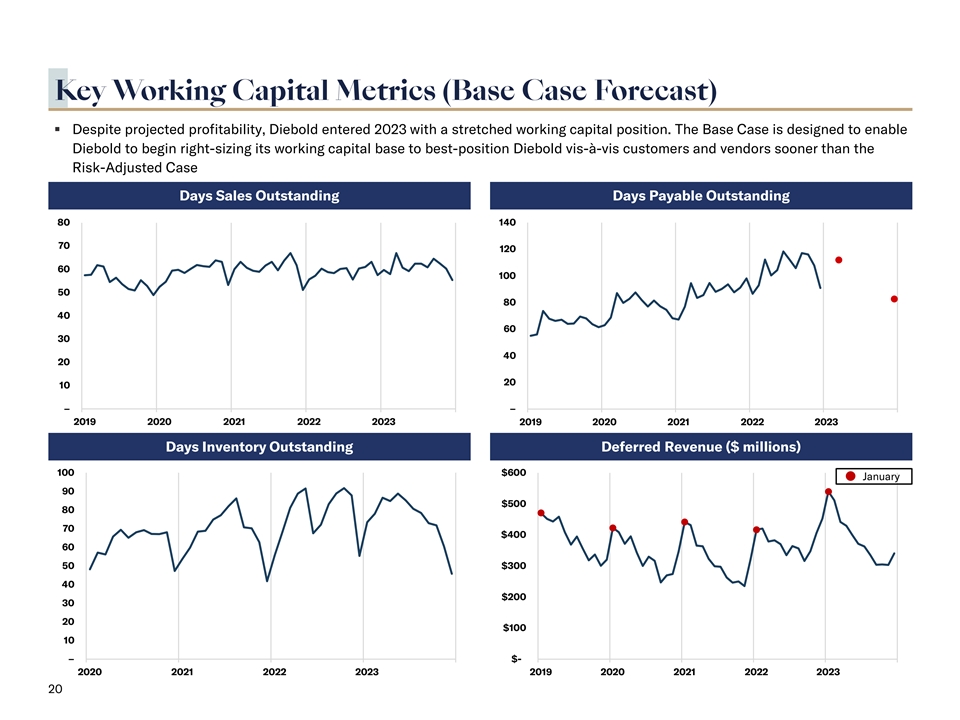 Key Working Capital Metrics (Base Case Forecast) § Despite projected profitability, Diebold entered 2023 with a stretched working capital position. The Base Case is designed to enable Diebold to begin right-sizing its working capital base to best-position Diebold vis-à-vis customers and vendors sooner than the Risk-Adjusted Case Days Sales Outstanding Days Payable Outstanding 80 140 70 120 60 100 50 80 40 60 30 40 20 20 10 – – 2019 2020 2021 2022 2023 2019 2020 2021 2022 2023 Days Inventory Outstanding Deferred Revenue ($ millions) 100 $600 January 90 $500 80 70 $400 60 50 $300 40 $200 30 20 $100 10 – $- 2020 2021 2022 2023 2019 2020 2021 2022 2023 20