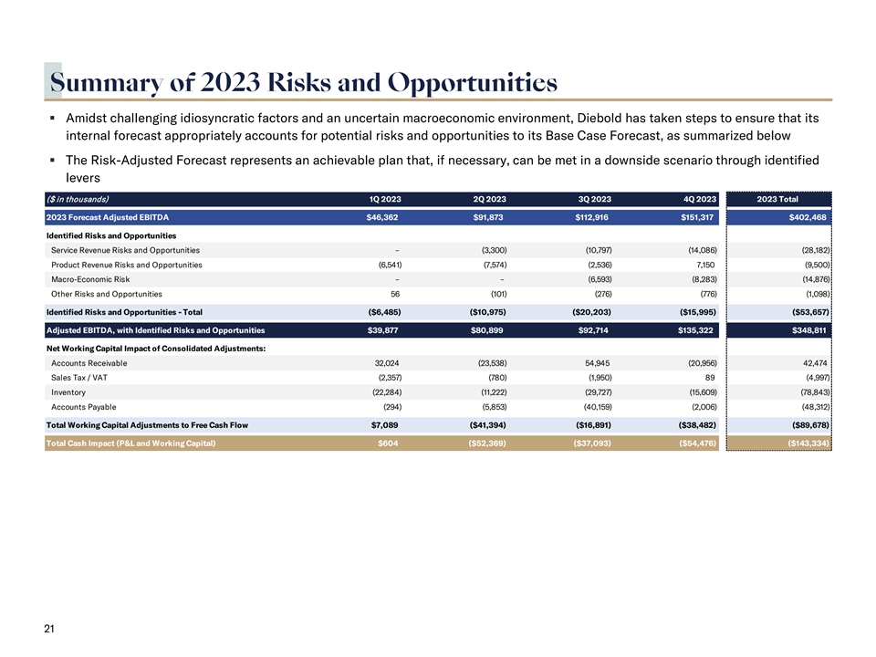 Summary of 2023 Risks and Opportunities § Amidst challenging idiosyncratic factors and an uncertain macroeconomic environment, Diebold has taken steps to ensure that its internal forecast appropriately accounts for potential risks and opportunities to its Base Case Forecast, as summarized below § The Risk-Adjusted Forecast represents an achievable plan that, if necessary, can be met in a downside scenario through identified levers ($ in thousands) 1Q 2023 2Q 2023 3Q 2023 4Q 2023 2023 Total 2023 Forecast Adjusted EBITDA $46,362 $91,873 $112,916 $151,317 $402,468 Identified Risks and Opportunities Service Revenue Risks and Opportunities – (3,300) (10,797) (14,086) (28,182) Product Revenue Risks and Opportunities (6,541) (7,574) (2,536) 7,150 (9,500) Macro-Economic Risk – – (6,593) (8,283) (14,876) Other Risks and Opportunities 56 (101) (276) (776) (1,098) Identified Risks and Opportunities - Total ($6,485) ($10,975) ($20,203) ($15,995) ($53,657) Adjusted EBITDA, with Identified Risks and Opportunities $39,877 $80,899 $92,714 $135,322 $348,811 Net Working Capital Impact of Consolidated Adjustments: Accounts Receivable 32,024 (23,538) 54,945 (20,956) 42,474 Sales Tax / VAT (2,357) (780) (1,950) 89 (4,997) Inventory (22,284) (11,222) (29,727) (15,609) (78,843) Accounts Payable (294) (5,853) (40,159) (2,006) (48,312) Total Working Capital Adjustments to Free Cash Flow $7,089 ($41,394) ($16,891) ($38,482) ($89,678) Total Cash Impact (P&L and Working Capital) $604 ($52,369) ($37,093) ($54,476) ($143,334) 21