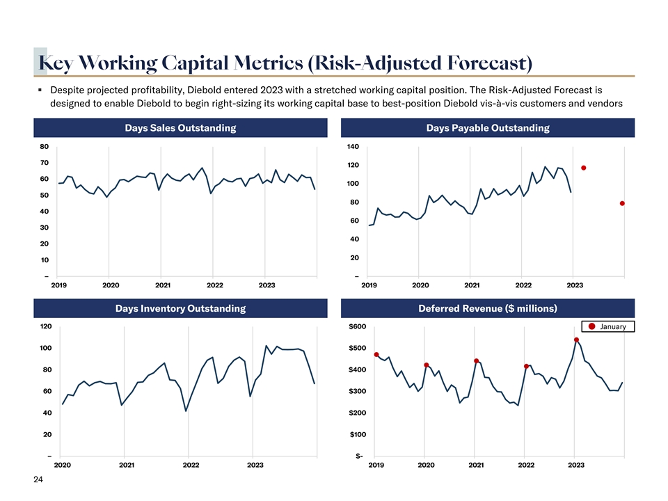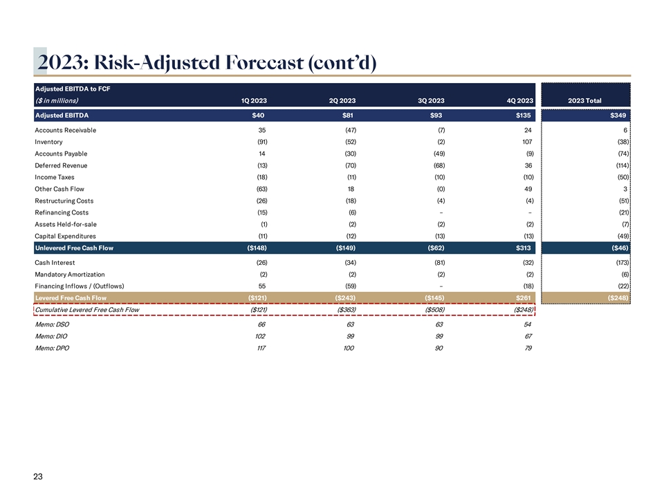 2023: Risk-Adjusted Forecast (cont’d) Adjusted EBITDA to FCF ($ in millions) 1Q 2023 2Q 2023 3Q 2023 4Q 2023 2023 Total Adjusted EBITDA $40 $81 $93 $135 $349 Accounts Receivable 35 (47) (7) 24 6 Inventory (91) (52) (2) 107 (38) Accounts Payable 14 (30) (49) (9) (74) Deferred Revenue (13) (70) (68) 36 (114) Income Taxes (18) (11) (10) (10) (50) Other Cash Flow (63) 18 (0) 49 3 Restructuring Costs (26) (18) (4) (4) (51) Refinancing Costs (15) (6) – – (21) Assets Held-for-sale (1) (2) (2) (2) (7) Capital Expenditures (11) (12) (13) (13) (49) Unlevered Free Cash Flow ($148) ($149) ($62) $313 ($46) Cash Interest (26) (34) (81) (32) (173) Mandatory Amortization (2) (2) (2) (2) (6) Financing Inflows / (Outflows) 55 (59) – (18) (22) Levered Free Cash Flow ($121) ($243) ($145) $261 ($248) Cumulative Levered Free Cash Flow ($121) ($363) ($508) ($248) Memo: DSO 66 63 63 54 Memo: DIO 102 99 99 67 Memo: DPO 117 100 90 79 23