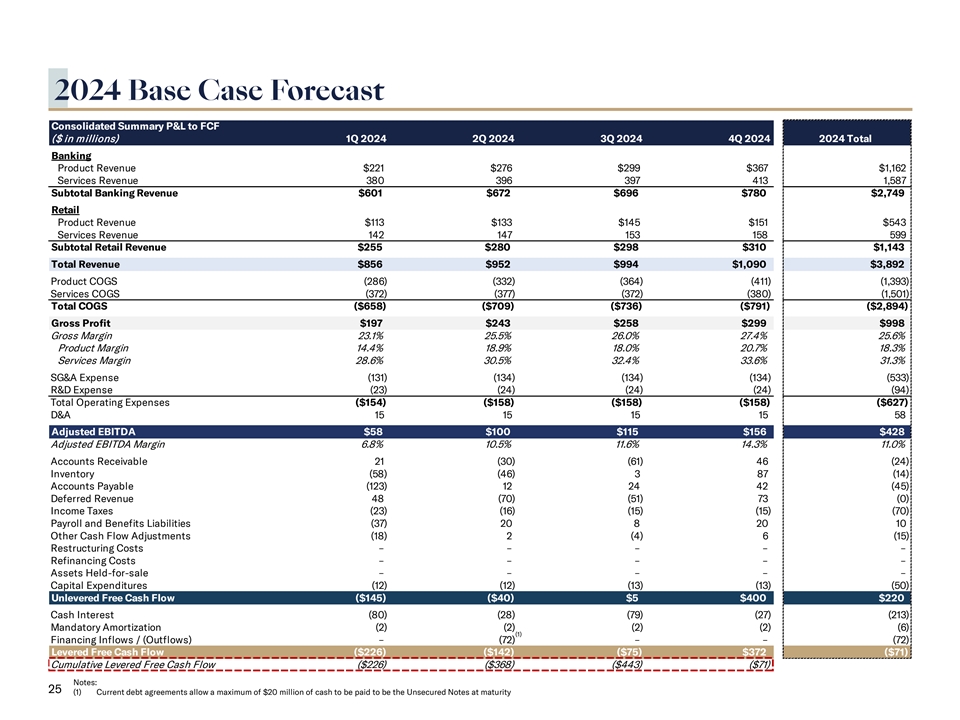 2024 Risk-Adjusted Forecast Consolidated Summary P&L to FCF ($ in millions) 1Q 2024 2Q 2024 3Q 2024 4Q 2024 2024 Total Banking Product Revenue $189 $253 $254 $344 $1,039 Services Revenue 372 388 388 410 1,558 Subtotal Banking Revenue $560 $641 $642 $753 $2,597 Retail Product Revenue $113 $131 $140 $150 $535 Services Revenue 142 147 153 159 601 Subtotal Retail Revenue $256 $279 $293 $309 $1,136 Total Revenue $816 $920 $935 $1,063 $3,733 Product COGS (263) (320) (325) (388) (1,295) Services COGS (367) (376) (369) (385) (1,497) Total COGS ($630) ($695) ($694) ($773) ($2,792) Gross Profit $186 $225 $241 $290 $941 Gross Margin 22.8% 24.4% 25.7% 27.3% 25.2% Product Margin 13.0% 16.8% 17.5% 21.5% 17.7% Services Margin 28.6% 29.9% 31.7% 32.3% 30.7% SG&A Expense (131) (134) (134) (134) (533) R&D Expense (23) (24) (24) (24) (94) Total Operating Expenses ($154) ($158) ($158) ($158) ($626) D&A 15 15 15 15 58 Adjusted EBITDA $47 $81 $97 $147 $373 Adjusted EBITDA Margin 5.8% 8.9% 10.4% 13.8% 10.0% Accounts Receivable 9 (39) (39) 20 (49) Inventory (26) (16) (12) 96 41 Accounts Payable (98) 24 1 60 (13) Deferred Revenue 48 (70) (51) 73 (0) Income Taxes (23) (16) (15) (15) (70) Payroll and Benefits Liabilities (37) 20 8 20 10 Other Cash Flow Adjustments (18) 2 (4) 6 (15) Restructuring Costs – – – – – Refinancing Costs – – – – – Assets Held-for-sale – – – – – Capital Expenditures (12) (12) (13) (13) (50) Unlevered Free Cash Flow ($111) ($25) ($29) $392 $227 Cash Interest (80) (28) (78) (27) (213) Mandatory Amortization (2) (2) (2) (2) (6) (1) Financing Inflows / (Outflows) – (72) – – (72) Levered Free Cash Flow ($193) ($126) ($109) $364 ($64) Cumulative Levered Free Cash Flow ($193) ($319) ($428) ($64) Notes: 27 (1) Current debt agreements allow a maximum of $20 million of cash to be paid to be the Unsecured Notes at maturity