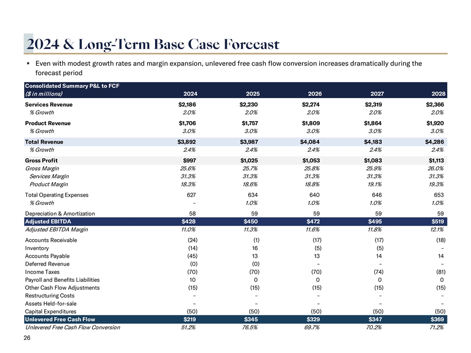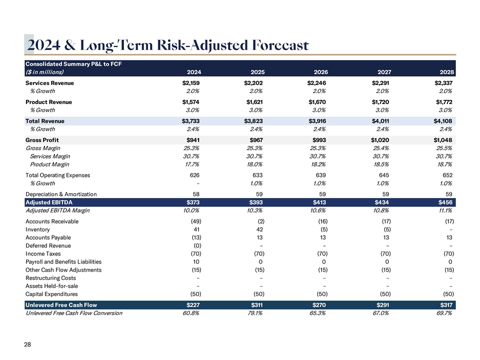 2024 & Long-Term Risk-Adjusted Forecast Consolidated Summary P&L to FCF ($ in millions) 2024 2025 2026 2027 2028 Services Revenue $2,159 $2,202 $2,246 $2,291 $2,337 % Growth 2.0% 2.0% 2.0% 2.0% 2.0% Product Revenue $1,574 $1,621 $1,670 $1,720 $1,772 % Growth 3.0% 3.0% 3.0% 3.0% 3.0% Total Revenue $3,733 $3,823 $3,916 $4,011 $4,108 % Growth 2.4% 2.4% 2.4% 2.4% 2.4% Gross Profit $941 $967 $993 $1,020 $1,048 Gross Margin 25.3% 25.3% 25.3% 25.4% 25.5% Services Margin 30.7% 30.7% 30.7% 30.7% 30.7% Product Margin 17.7% 18.0% 18.2% 18.5% 18.7% Total Operating Expenses 626 633 639 645 652 % Growth – 1.0% 1.0% 1.0% 1.0% Depreciation & Amortization 58 59 59 59 59 Adjusted EBITDA $373 $393 $413 $434 $456 Adjusted EBITDA Margin 10.0% 10.3% 10.6% 10.8% 11.1% Accounts Receivable (49) (2) (16) (17) (17) Inventory 41 42 (5) (5) – Accounts Payable (13) 13 13 13 13 Deferred Revenue (0) – – – – Income Taxes (70) (70) (70) (70) (70) Payroll and Benefits Liabilities 10 0 0 0 0 Other Cash Flow Adjustments (15) (15) (15) (15) (15) Restructuring Costs – – – – – Assets Held-for-sale – – – – – Capital Expenditures (50) (50) (50) (50) (50) Unlevered Free Cash Flow $227 $311 $270 $291 $317 Unlevered Free Cash Flow Conversion 60.8% 79.1% 65.3% 67.0% 69.7% 28